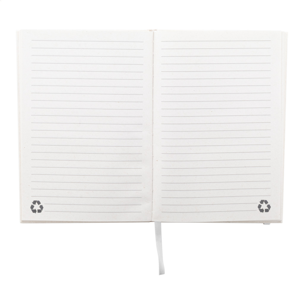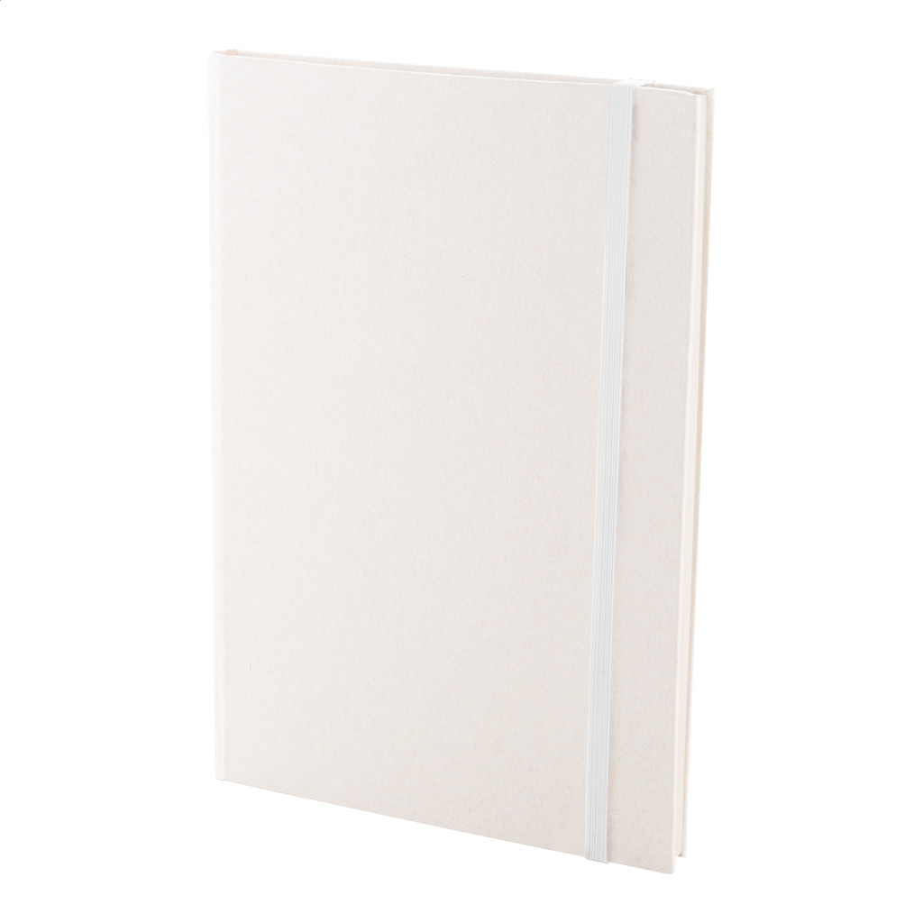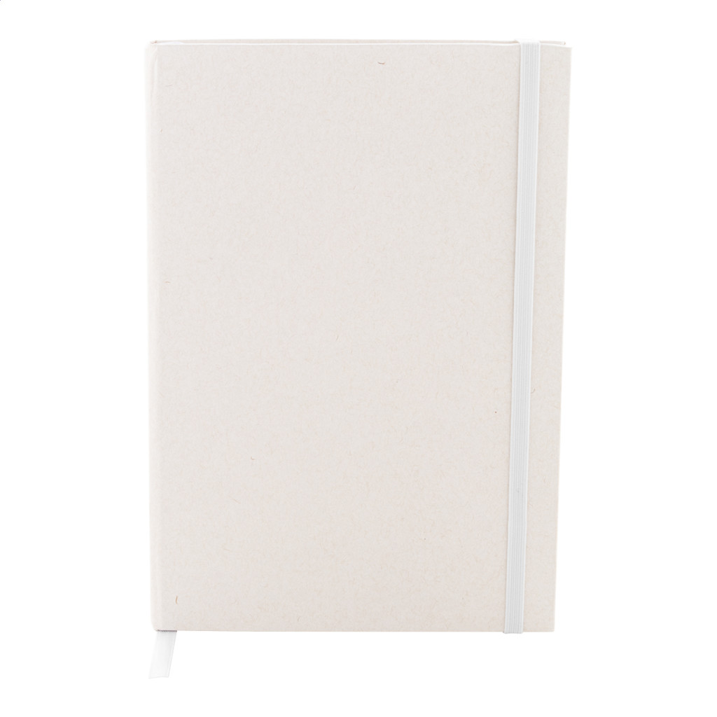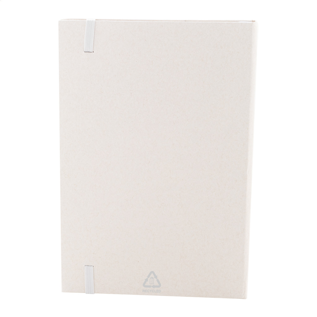 Újrahasznosított tejesdoboz anyagú jegyzetfüzet kemény borítóval és 80 vonalas lappal. Hozzáillő színű gumiszalaggal. A5 méretű.