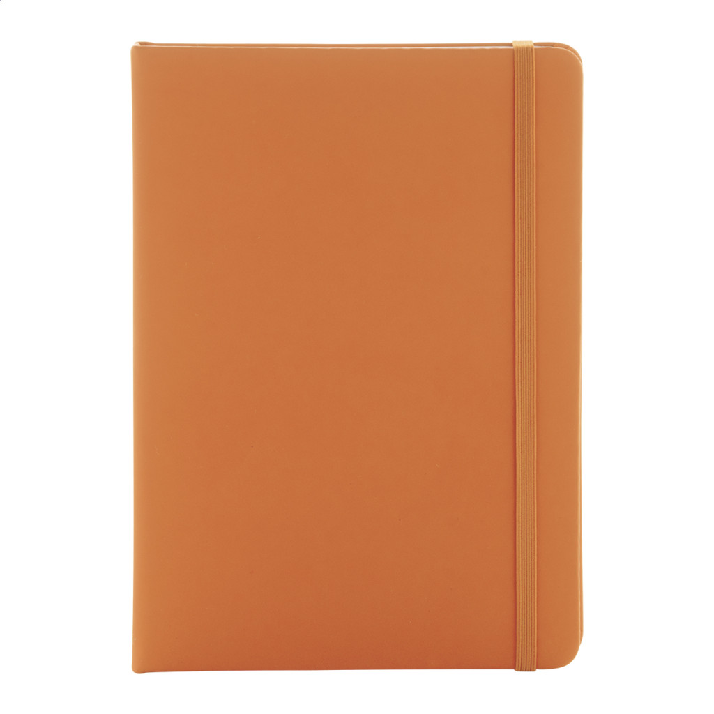 Úrahasznosított PU bőr borítású jegyzetfüzet újrahasznosított papírból készült 100 sima lappal. Hozzáillő színű gumipánttal és könyvjelzővel. A5 méretű.