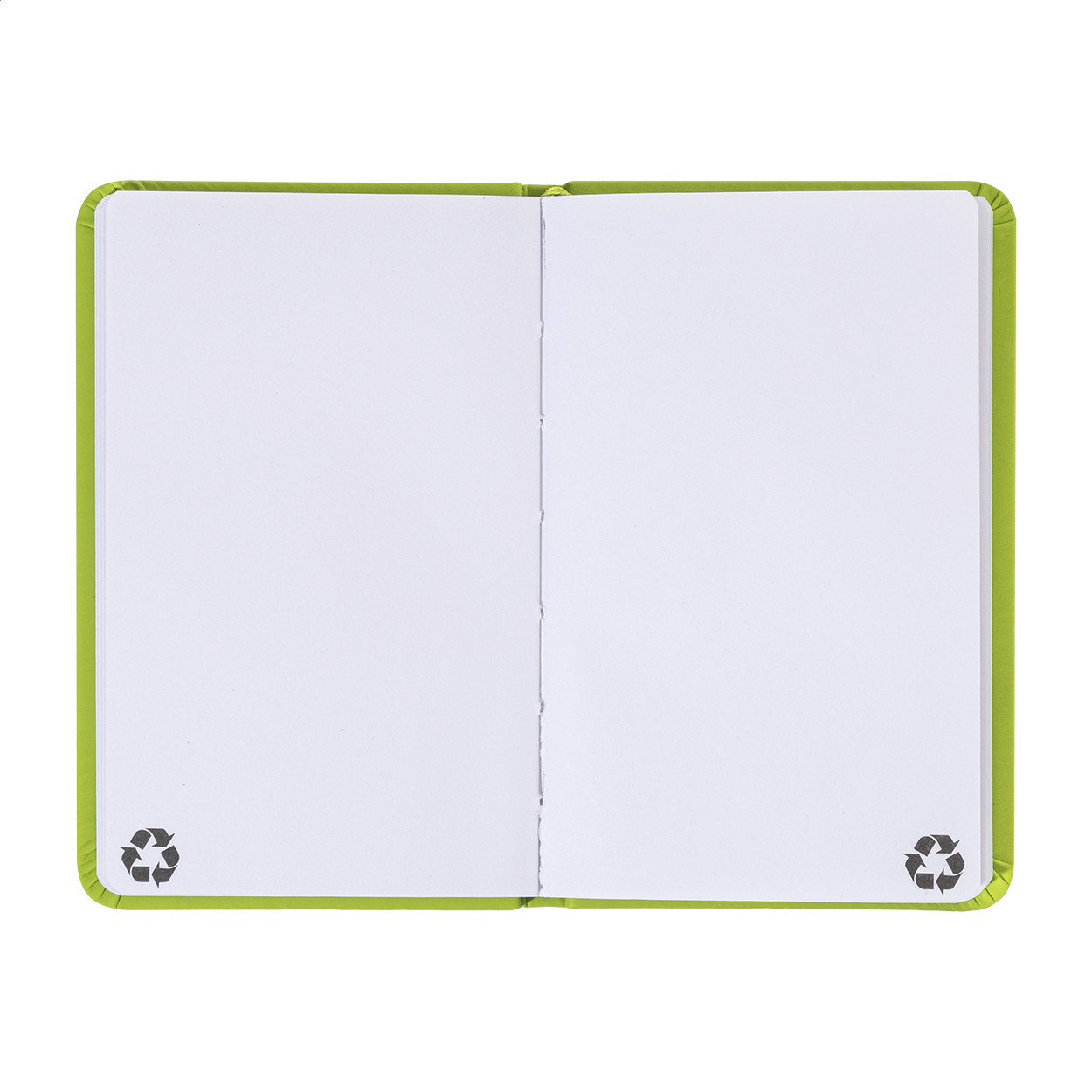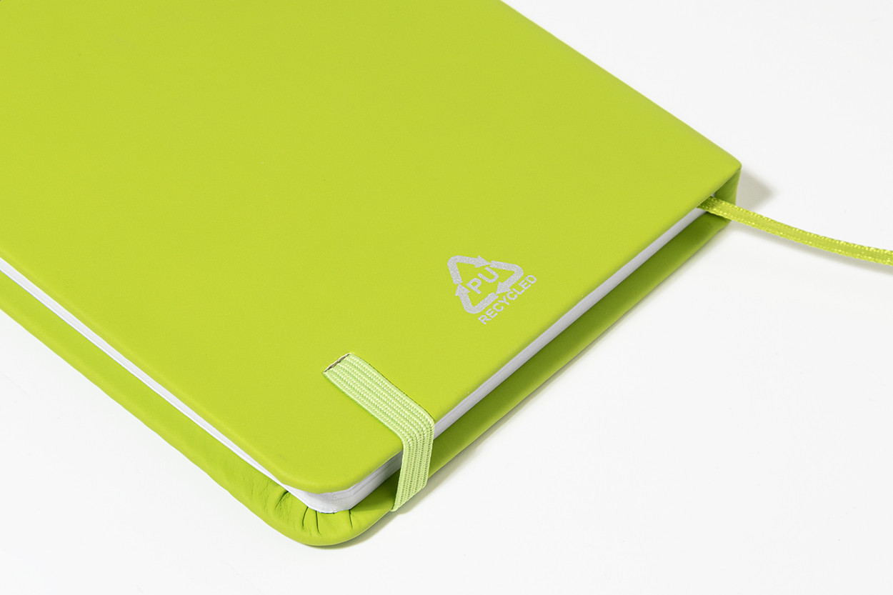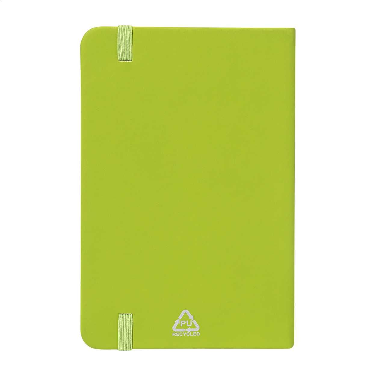 Úrahasznosított PU bőr borítású jegyzetfüzet újrahasznosított papírból készült 100 sima lappal. Hozzáillő színű gumipánttal és könyvjelzővel. A6 méretű.