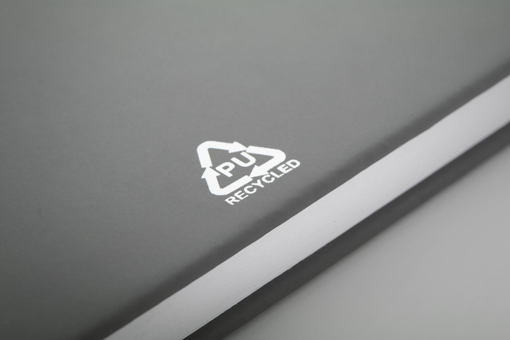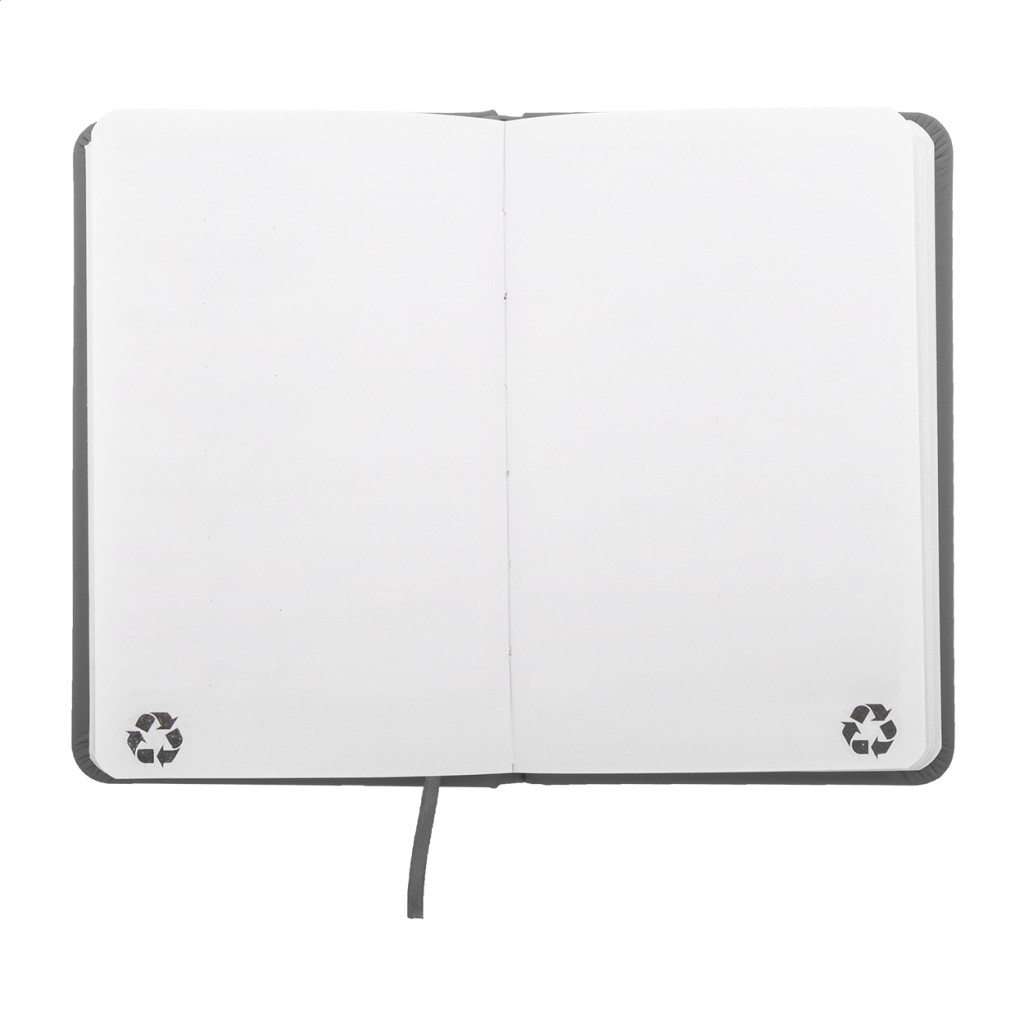 Úrahasznosított PU bőr borítású jegyzetfüzet újrahasznosított papírból készült 100 sima lappal. Hozzáillő színű gumipánttal és könyvjelzővel. A6 méretű.