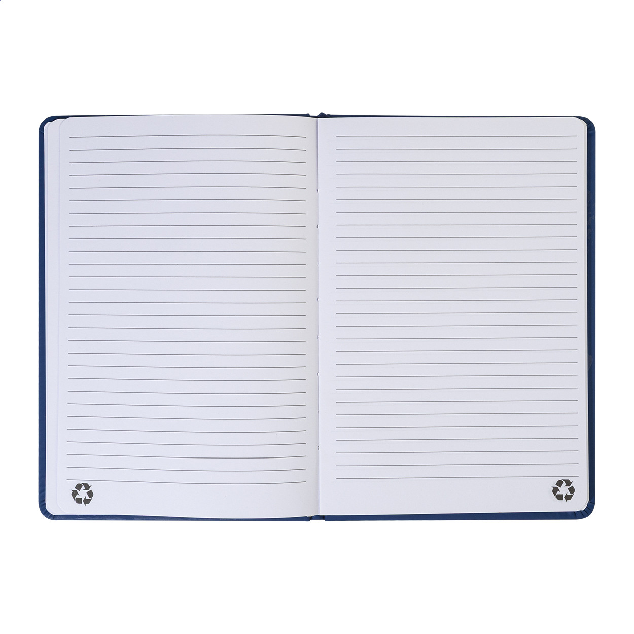Újrahasznosított PU bőr borítású jegyzetfüzet 100 vonalas lappal, újrahasznosított papírból. Megegyező színű könyvjelzővel és gumiszalaggal. A5 méretű.