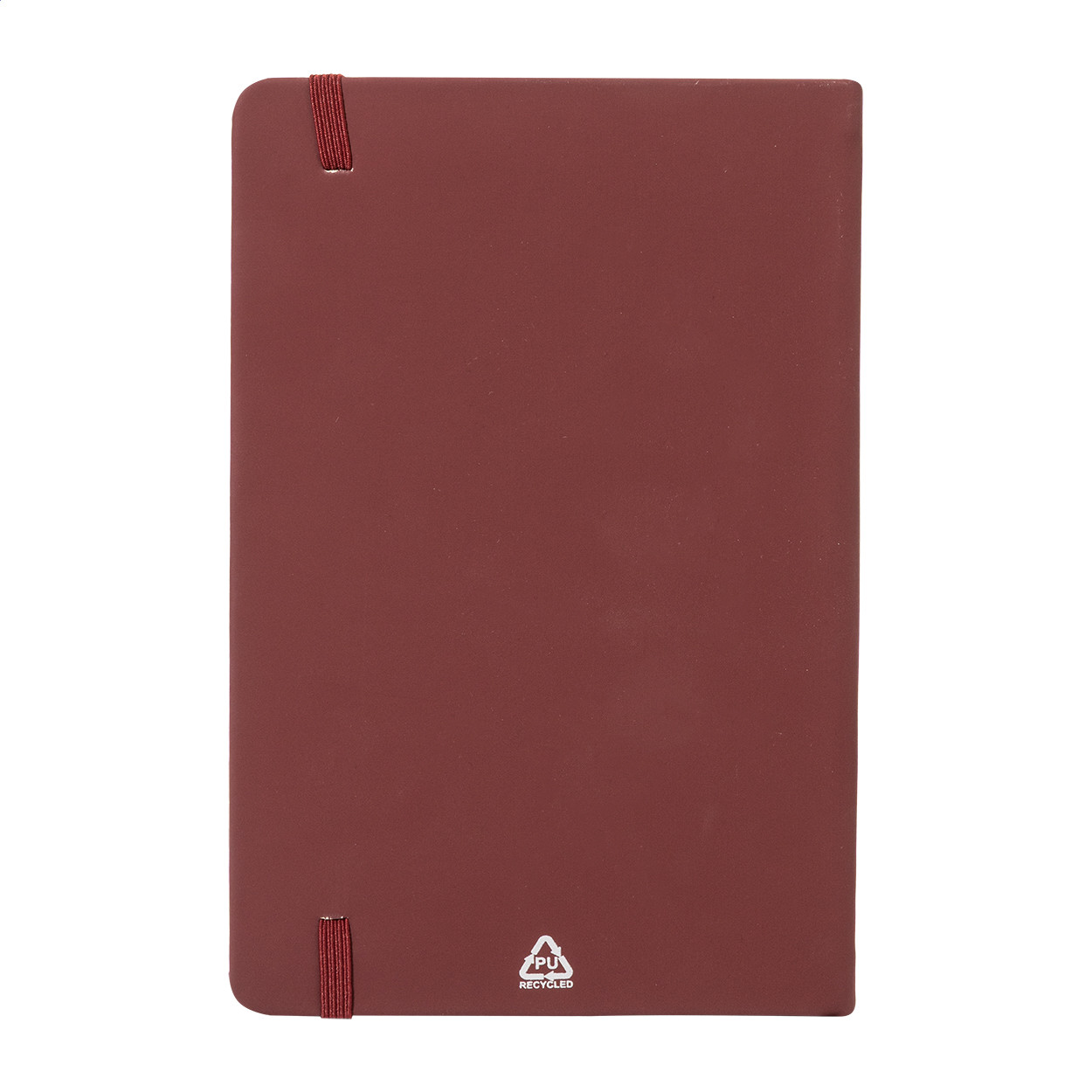Újrahasznosított PU bőr borítású jegyzetfüzet 100 vonalas lappal, újrahasznosított papírból. Megegyező színű könyvjelzővel és gumiszalaggal. A5 méretű.