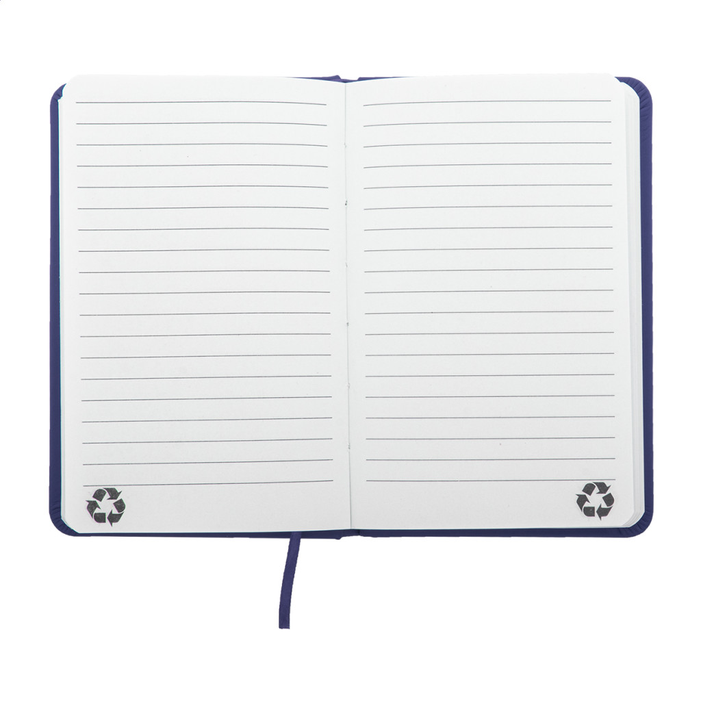 Újrahasznosított PU bőr borítású jegyzetfüzet 100 vonalas lappal, újrahasznosított papírból. Megegyező színű könyvjelzővel és gumiszalaggal. A6 méretű.