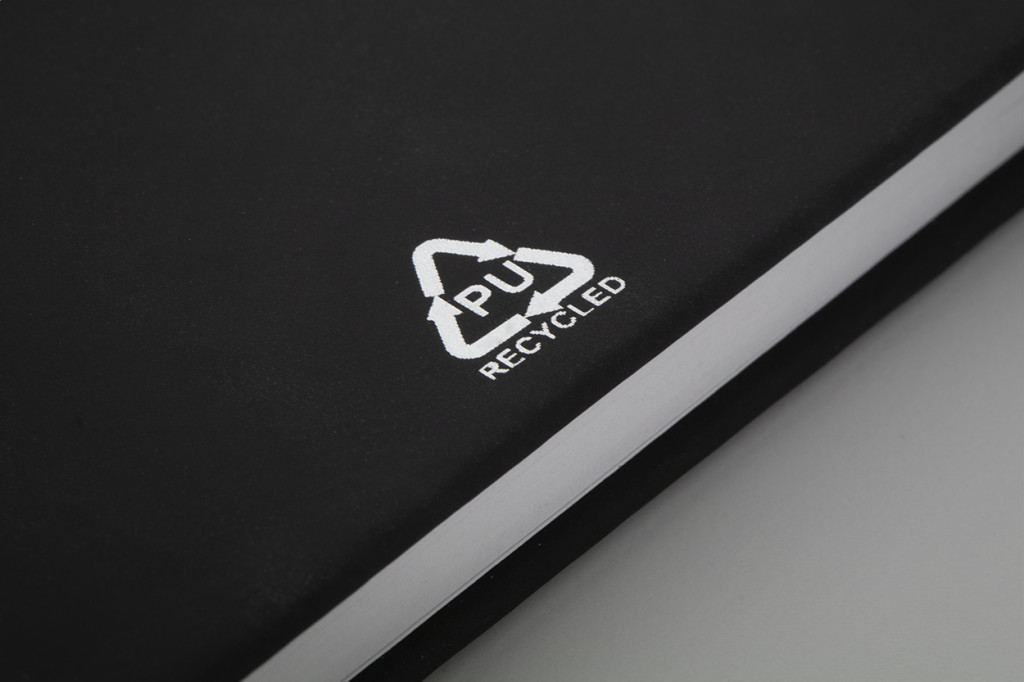 Újrahasznosított PU bőr borítású jegyzetfüzet 100 vonalas lappal, újrahasznosított papírból. Megegyező színű könyvjelzővel és gumiszalaggal. A6 méretű.