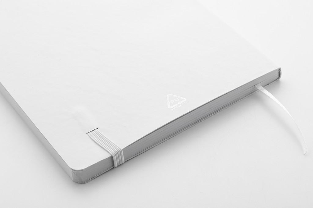 Újrahasznosított PU bőr, puha fedelű jegyzetfüzet 80 vonalas lappal, újrahasznosított papírból. Hozzáillő színű könyvjelzővel és gumiszalaggal. A5 méretű.