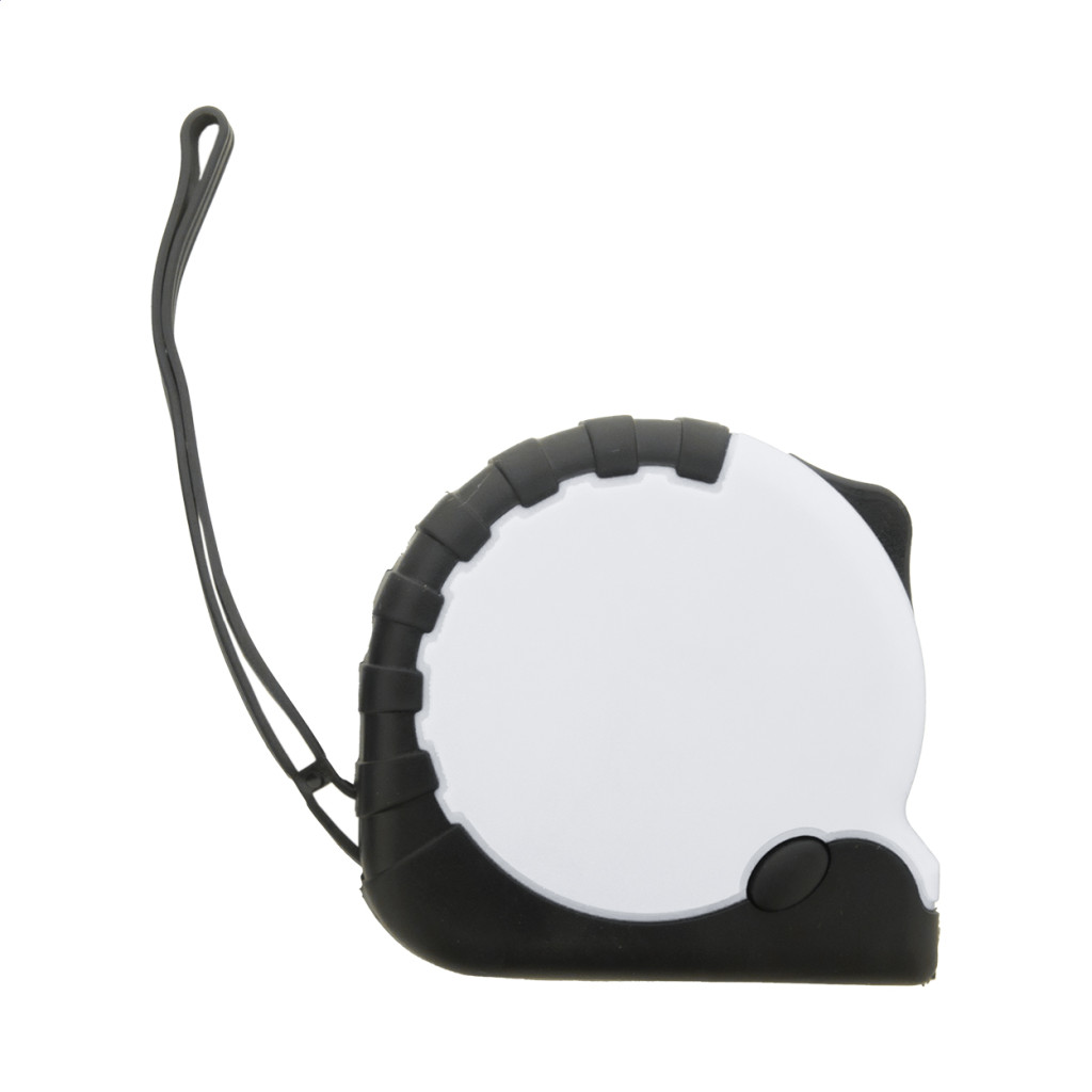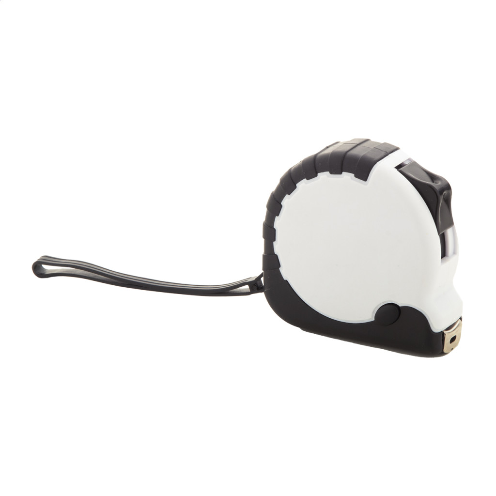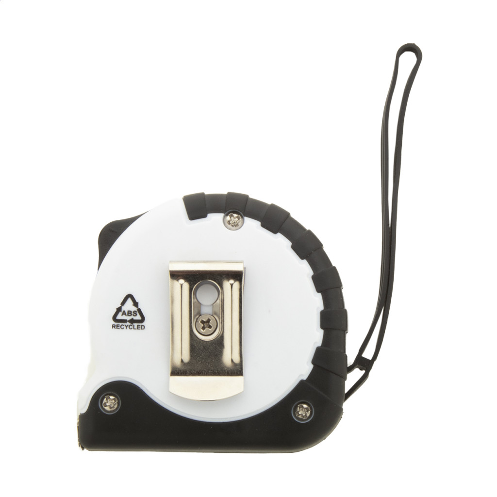Újrahasznosított ABS műanyag mérőszalag fékező funkcióval, fém klipsszel és csuklópánttal, 3 m.