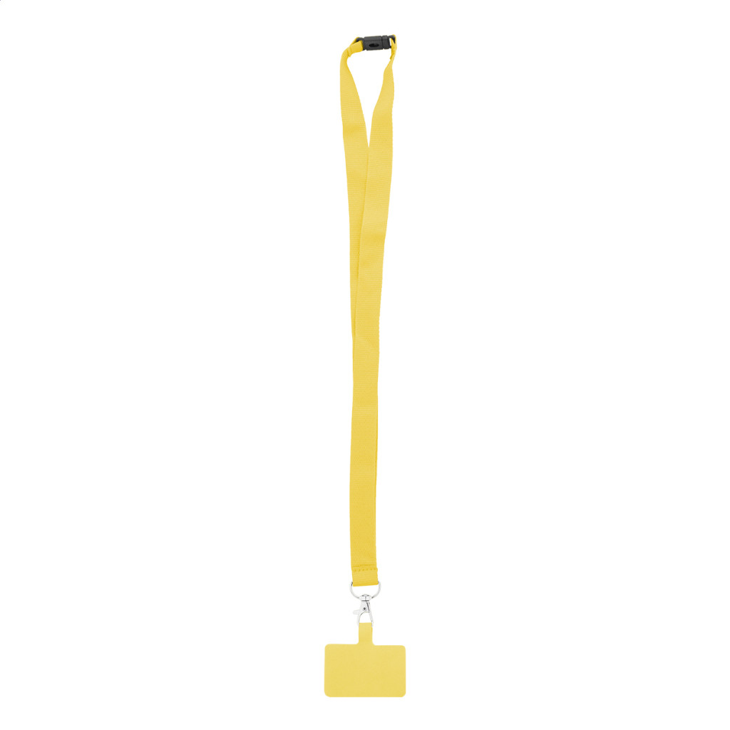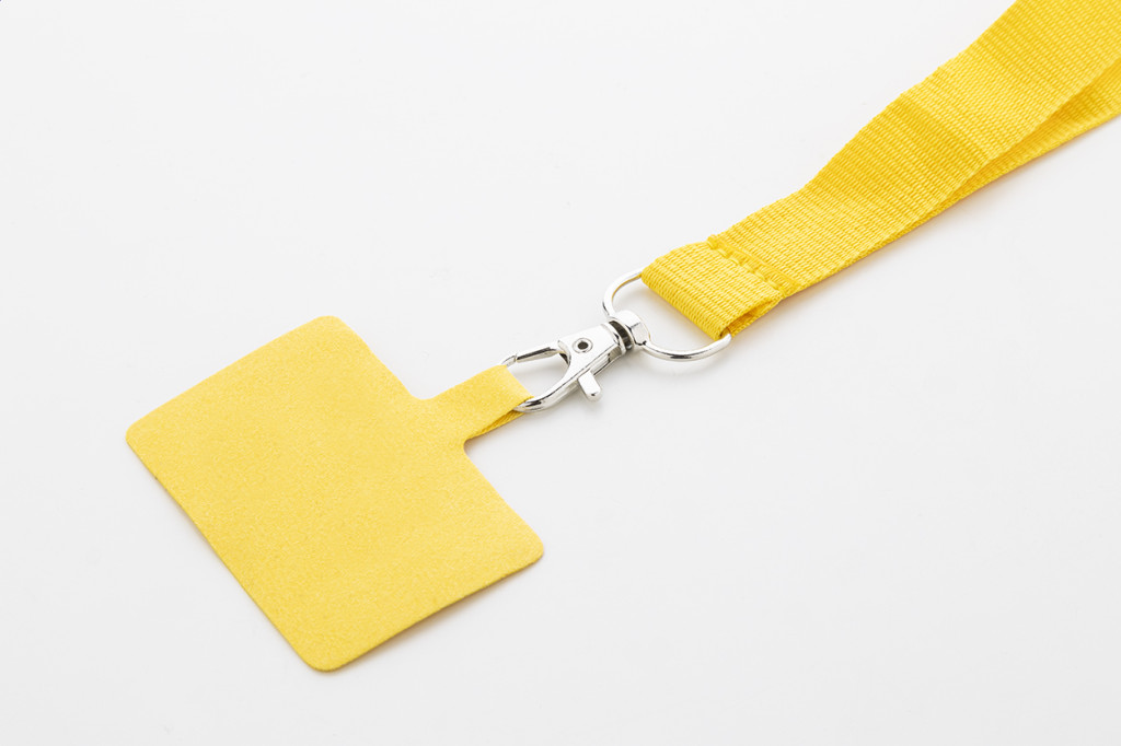 RPET mobiltartó nyakpánt fém karabinerrel, biztonsági csattal és hozzáillő színű telefonbetéttel.