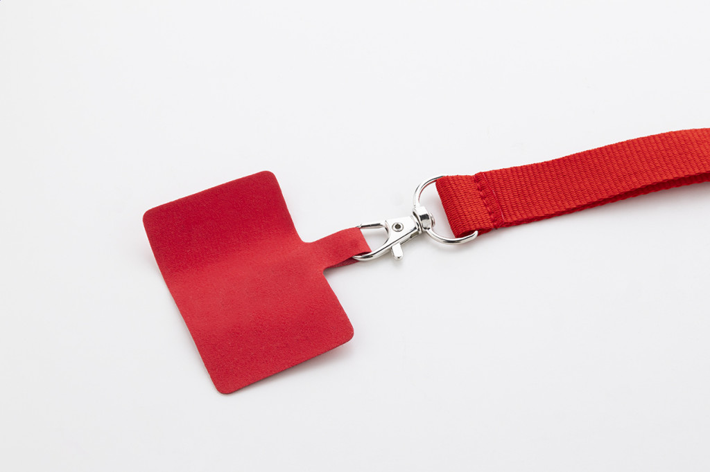 RPET mobiltartó nyakpánt fém karabinerrel, biztonsági csattal és hozzáillő színű telefonbetéttel.