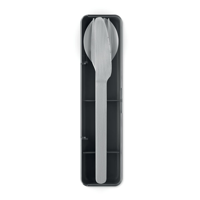 Rozsdamentes acél evőeszközkészlet PP tokban. A készlet villát, kést és kanalat tartalmaz.