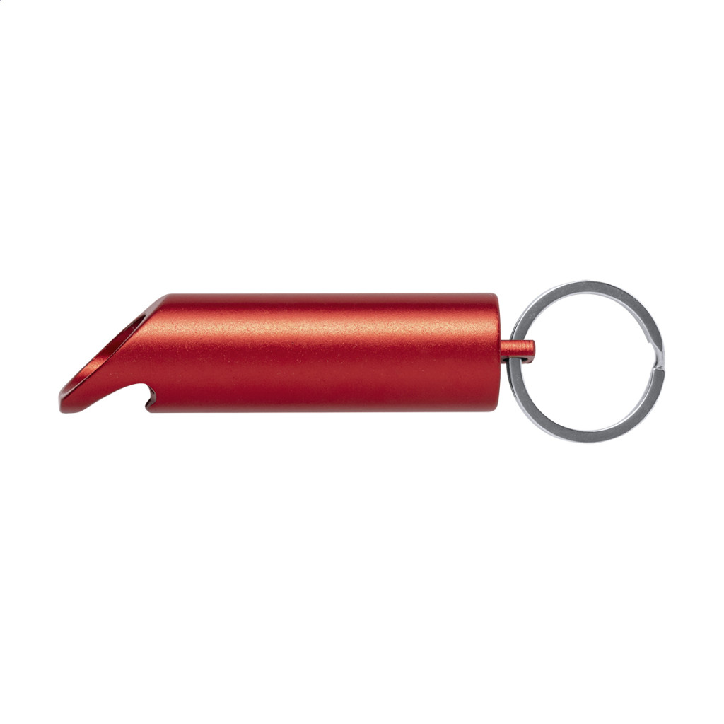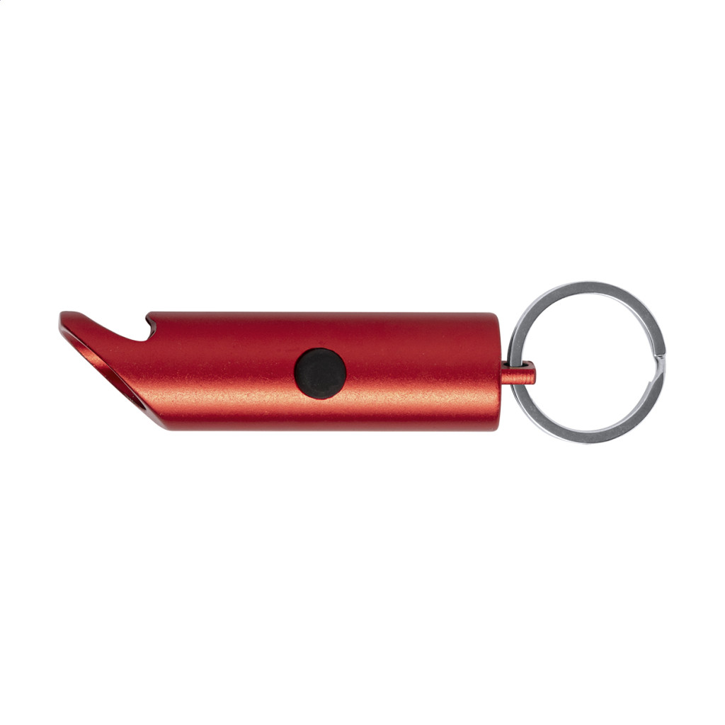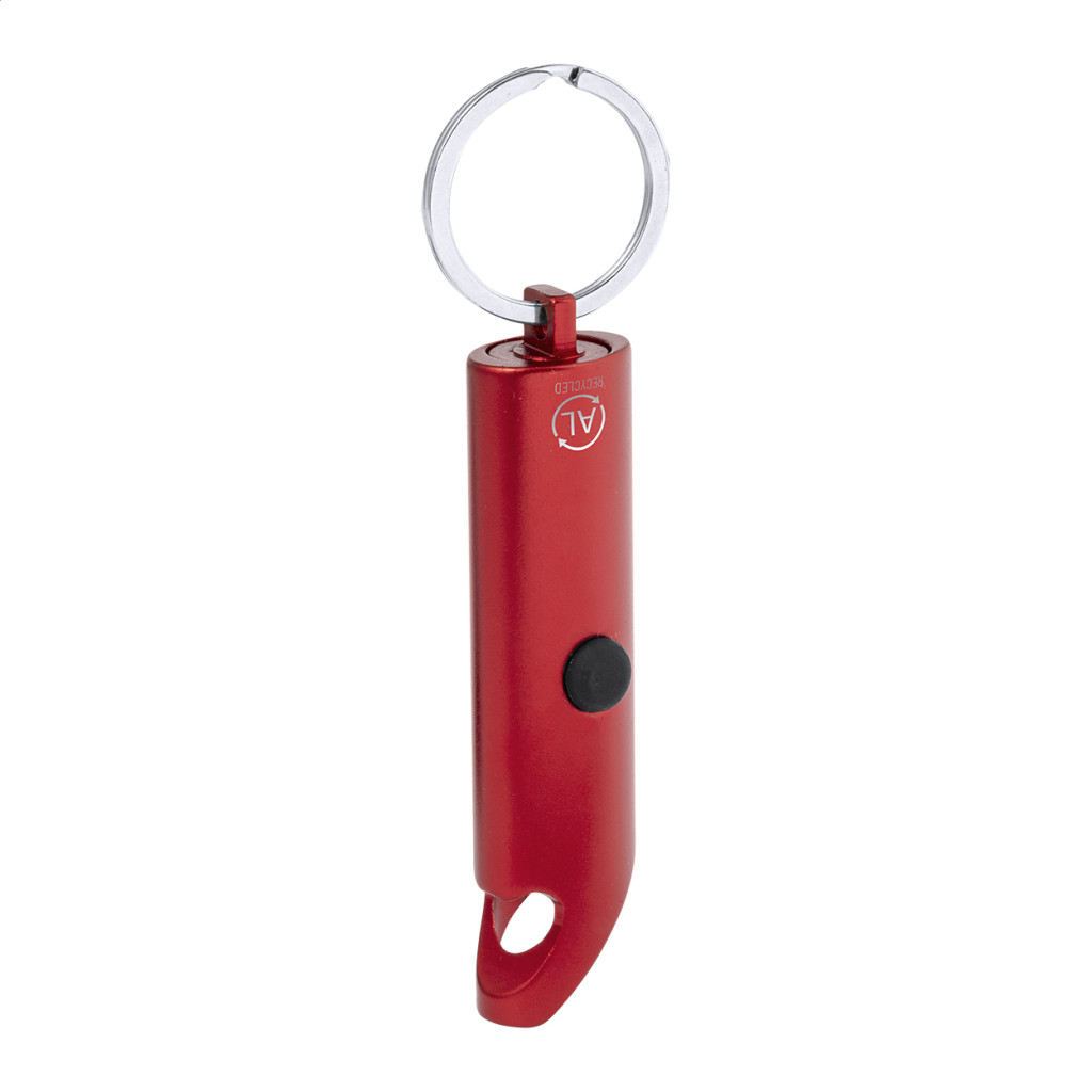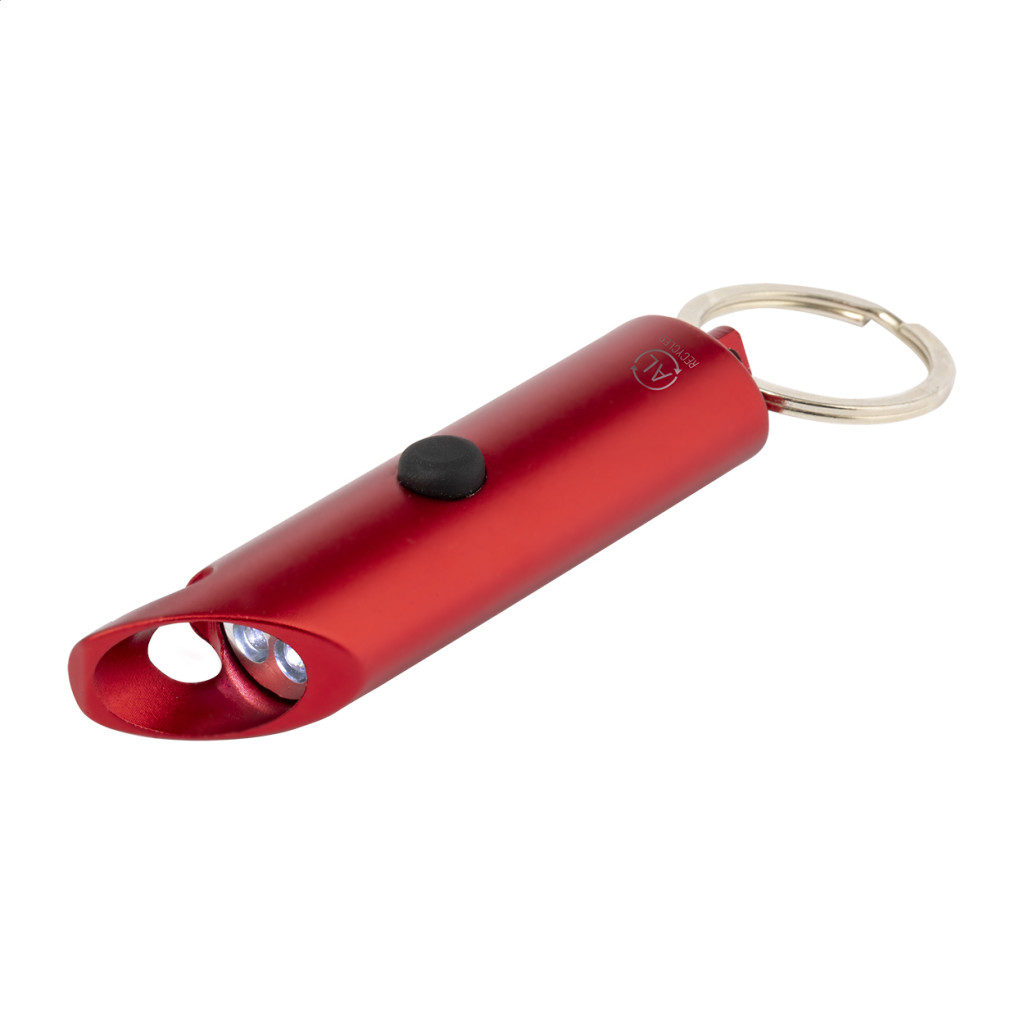 Mini, újrahasznosított alumínium elemlámpa 3 LED-del, üvegnyitóval és kulcstartóval. Gombelemmel szállítjuk.