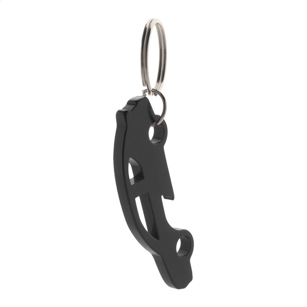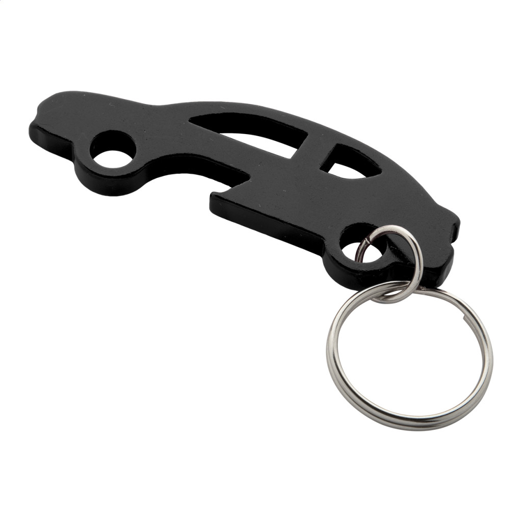 Alumíniumból készült, autó formájú kulcstartó üvegnyitó funkcióval.
