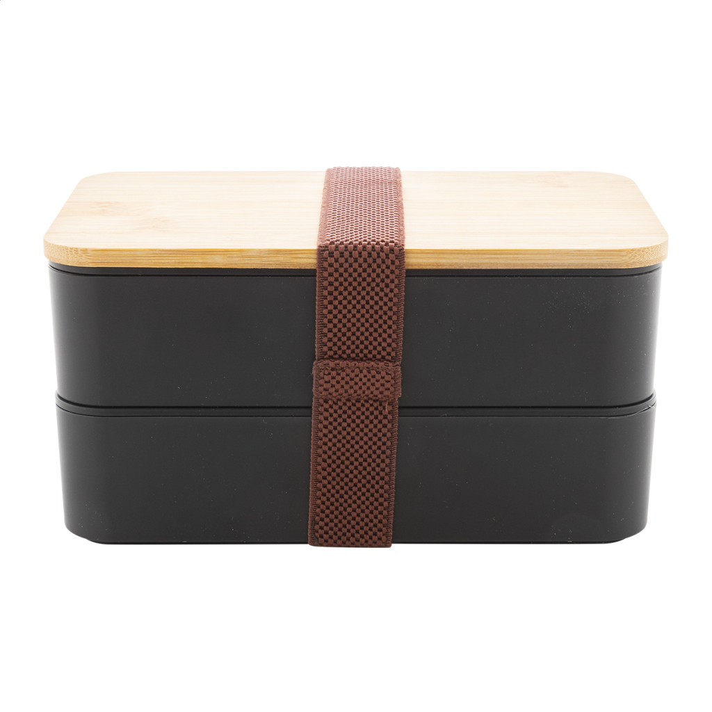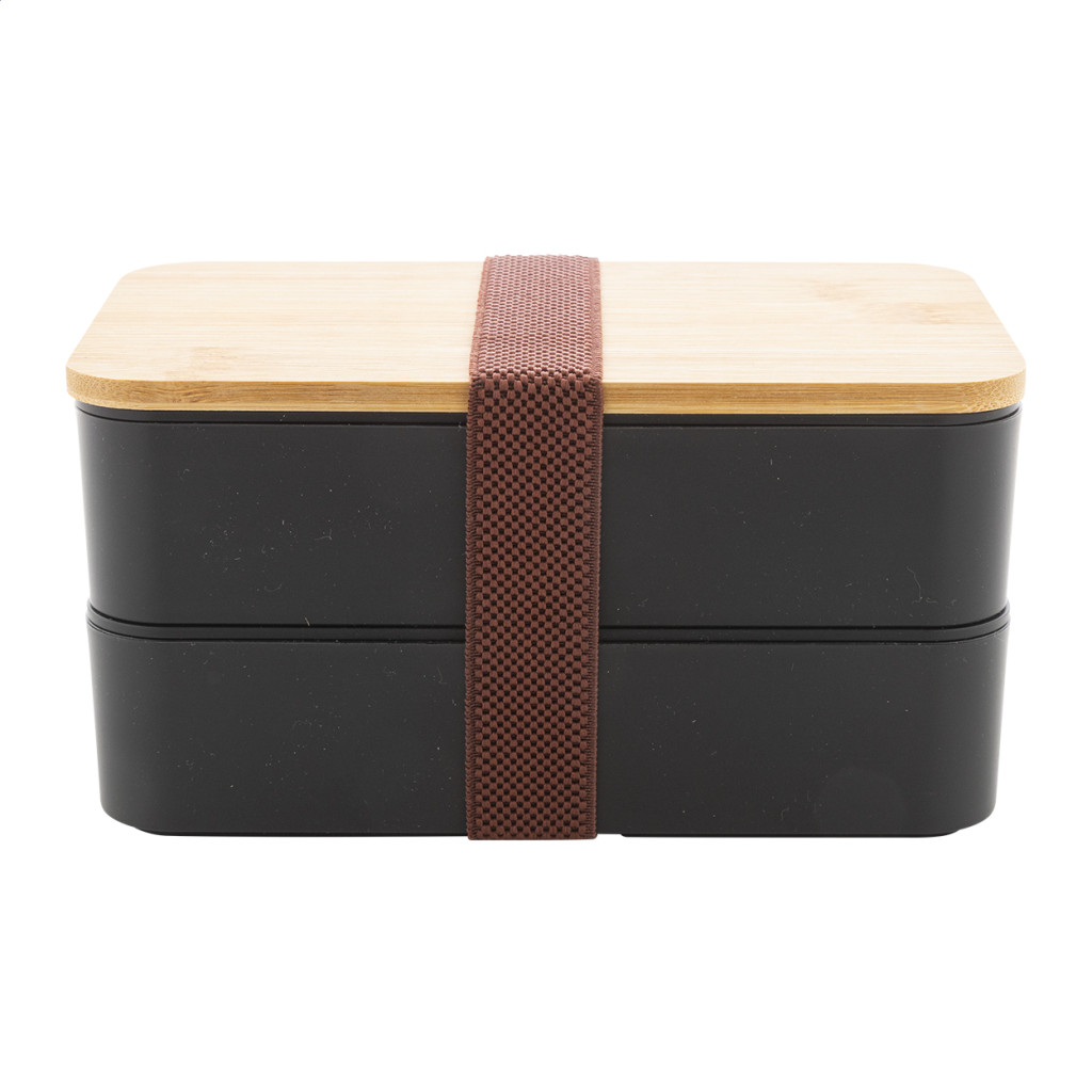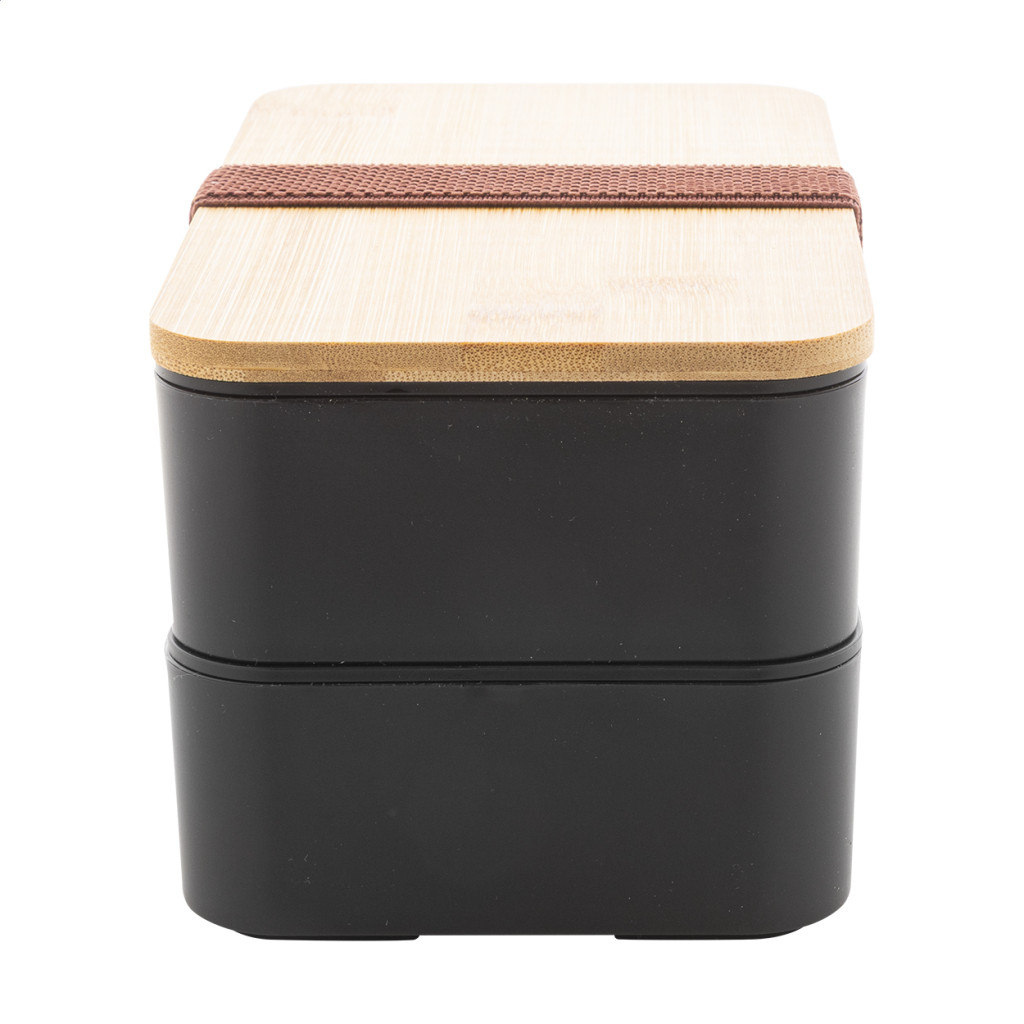 PP műanyag uzsonnás doboz evőeszköz készlettel (villa, kanál és kés), bambusz tetővel és rugalmas pánttal. 2 darab, egyenként 700 ml rekesszel.