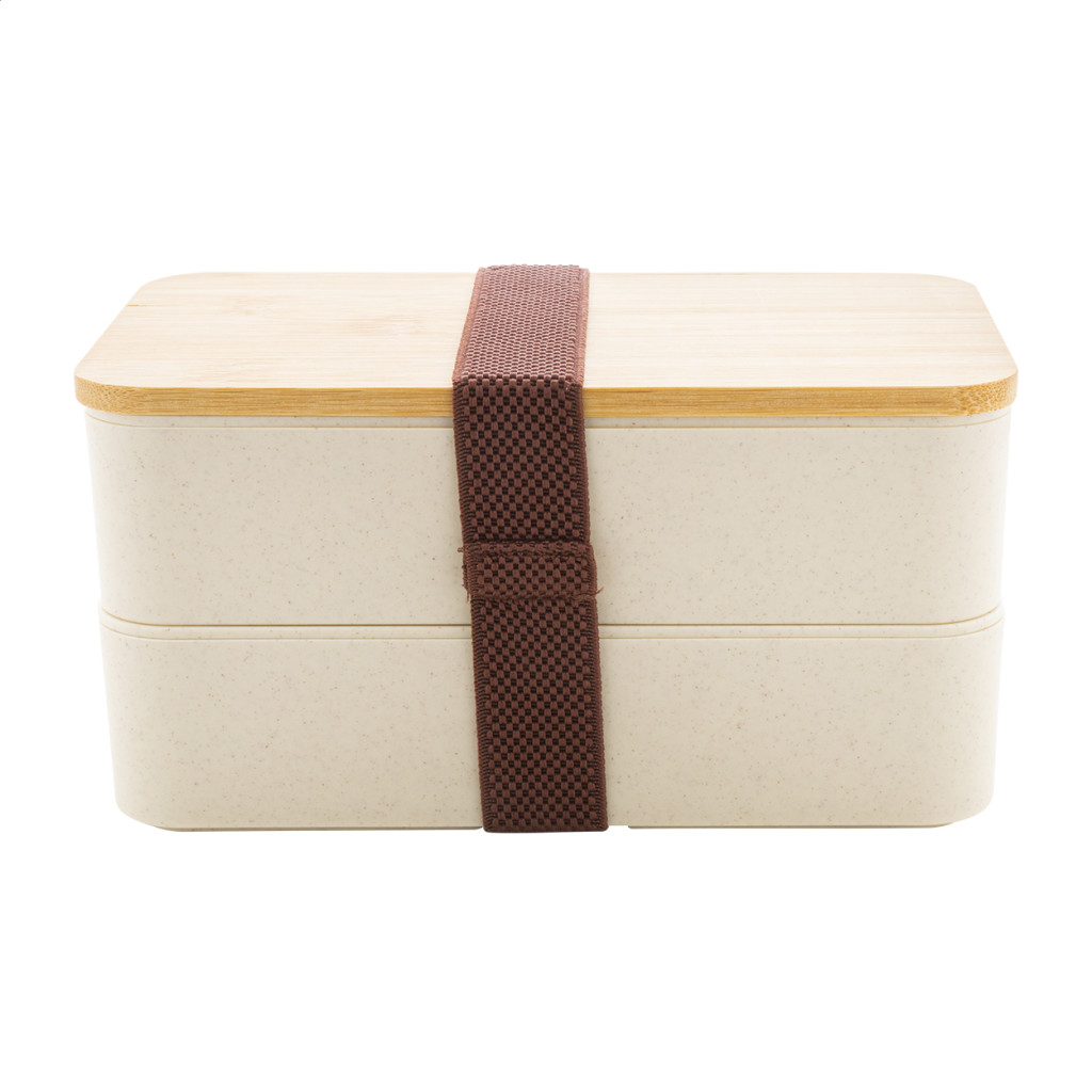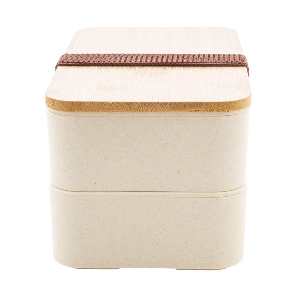 PP műanyag uzsonnás doboz evőeszköz készlettel (villa, kanál és kés), bambusz tetővel és rugalmas pánttal. 2 darab, egyenként 700 ml rekesszel.
