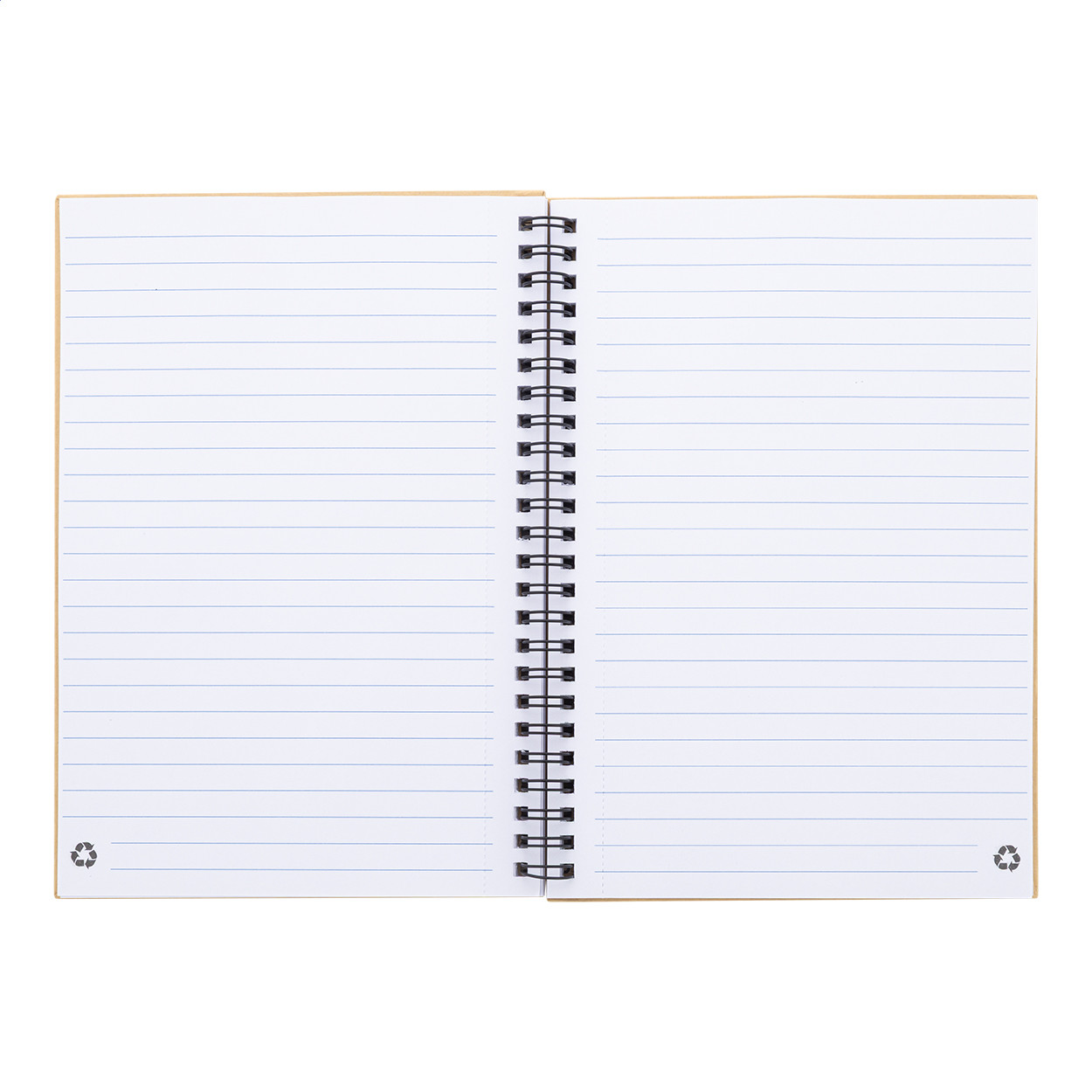 Újrahasznosított papír borítású spirál jegyzetfüzet 80 vonalas lappal, A5 méretű.