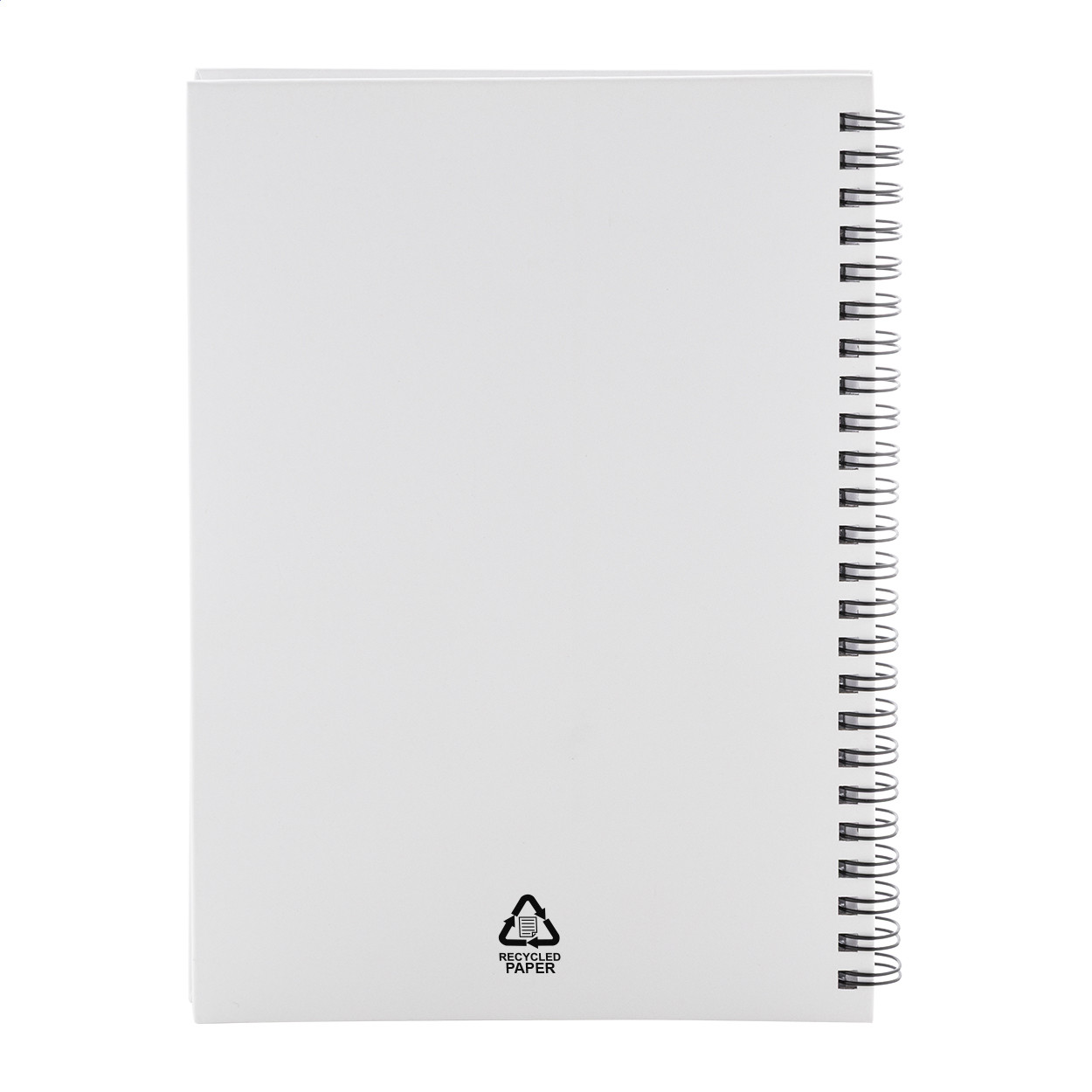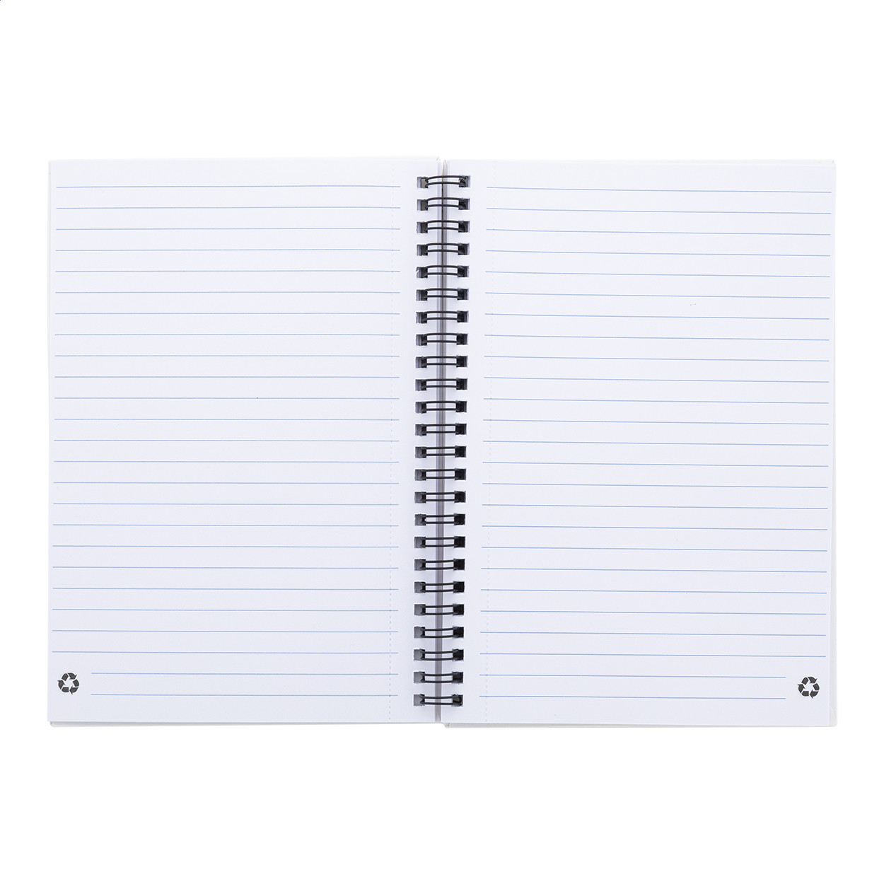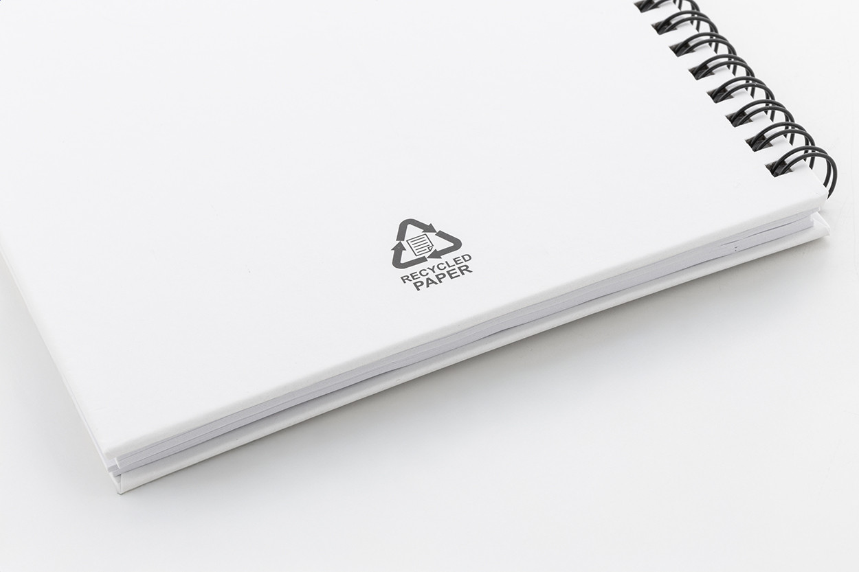 Újrahasznosított papír borítású spirál jegyzetfüzet 80 vonalas lappal, A5 méretű.