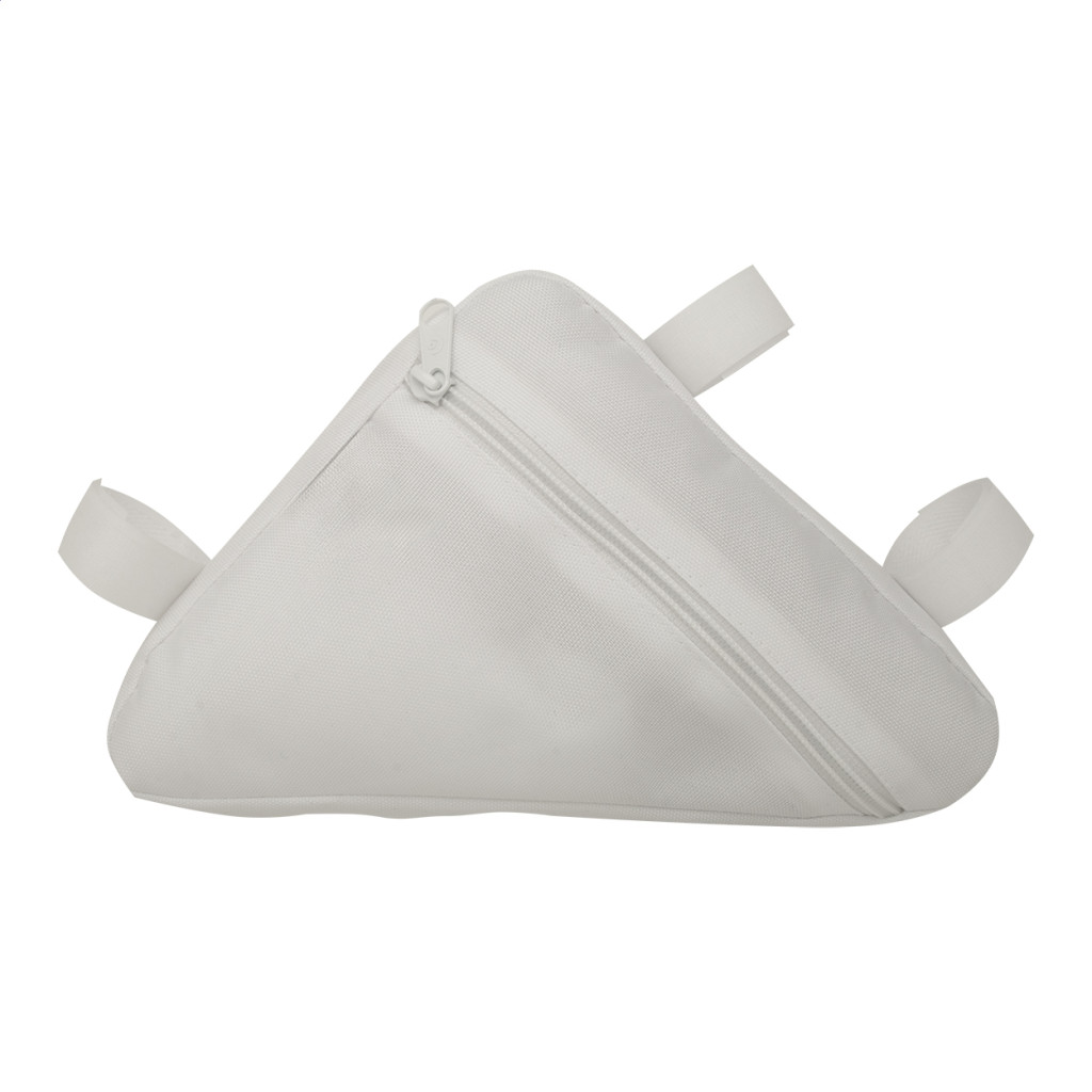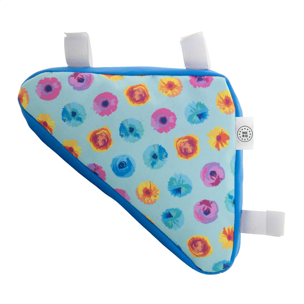 Egyedi gyártású, cipzáras, biciklivázra rögzíthető táska 600D RPET poliészterből, állítható tépőzáras pánttal. Teljes felületén szublimációs eljárással emblémázva, megkülönböztető RPET címkével. Minimális rendelési mennyiség: 25 db.