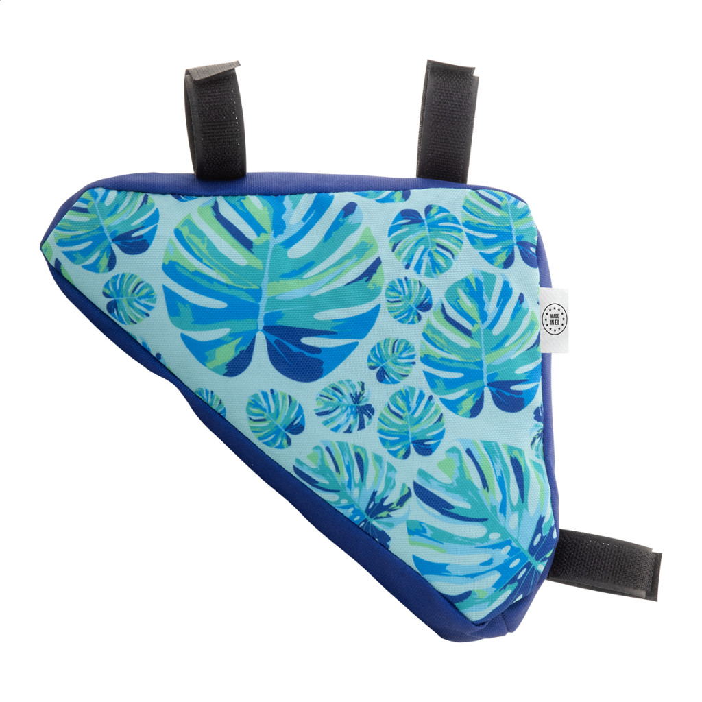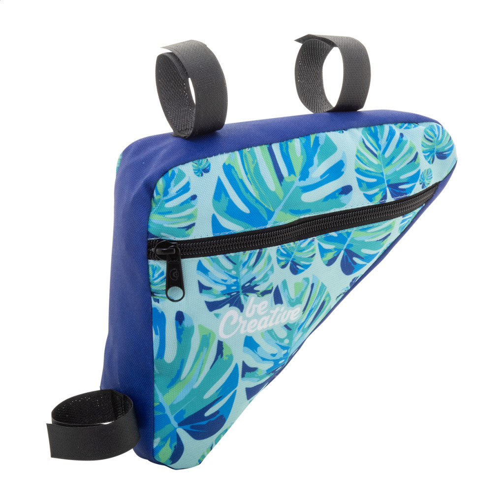 Egyedi gyártású, cipzáras, biciklivázra rögzíthető táska 600D RPET poliészterből, állítható tépőzáras pánttal. Teljes felületén szublimációs eljárással emblémázva, megkülönböztető RPET címkével. Minimális rendelési mennyiség: 25 db.