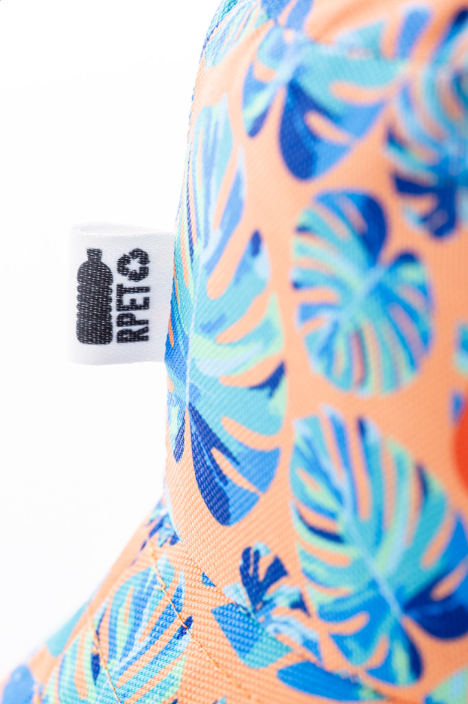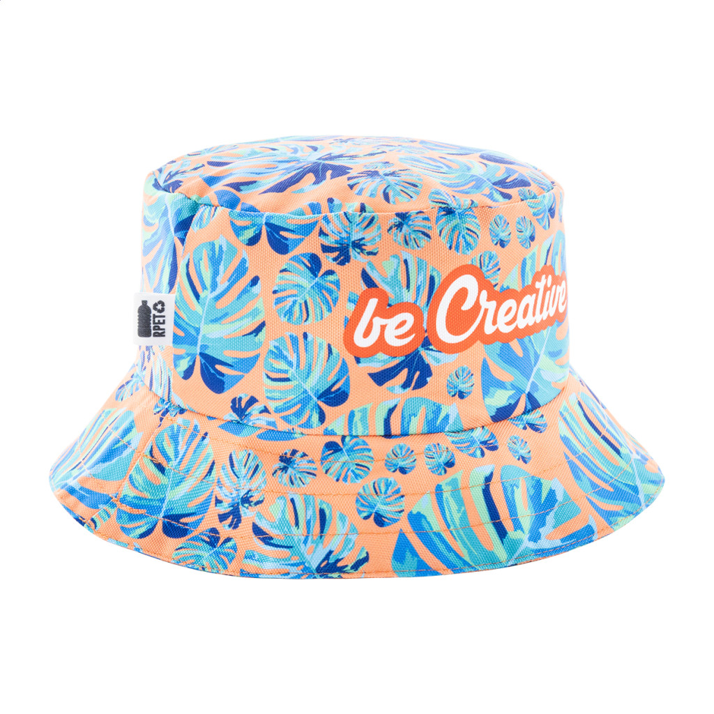 Egyedi gyártású RPET halászsapka, teljes felületén szublimációs nyomtatott grafikával. 600D RPET poliészterből (220 g/m²) készült, megkülönböztető RPET címkével. Minimális rendelési mennyiség: 25 db / méret. 3 méretben kapható: S (ø55cm gyereknek), M (ø58cm) és L (ø60cm).