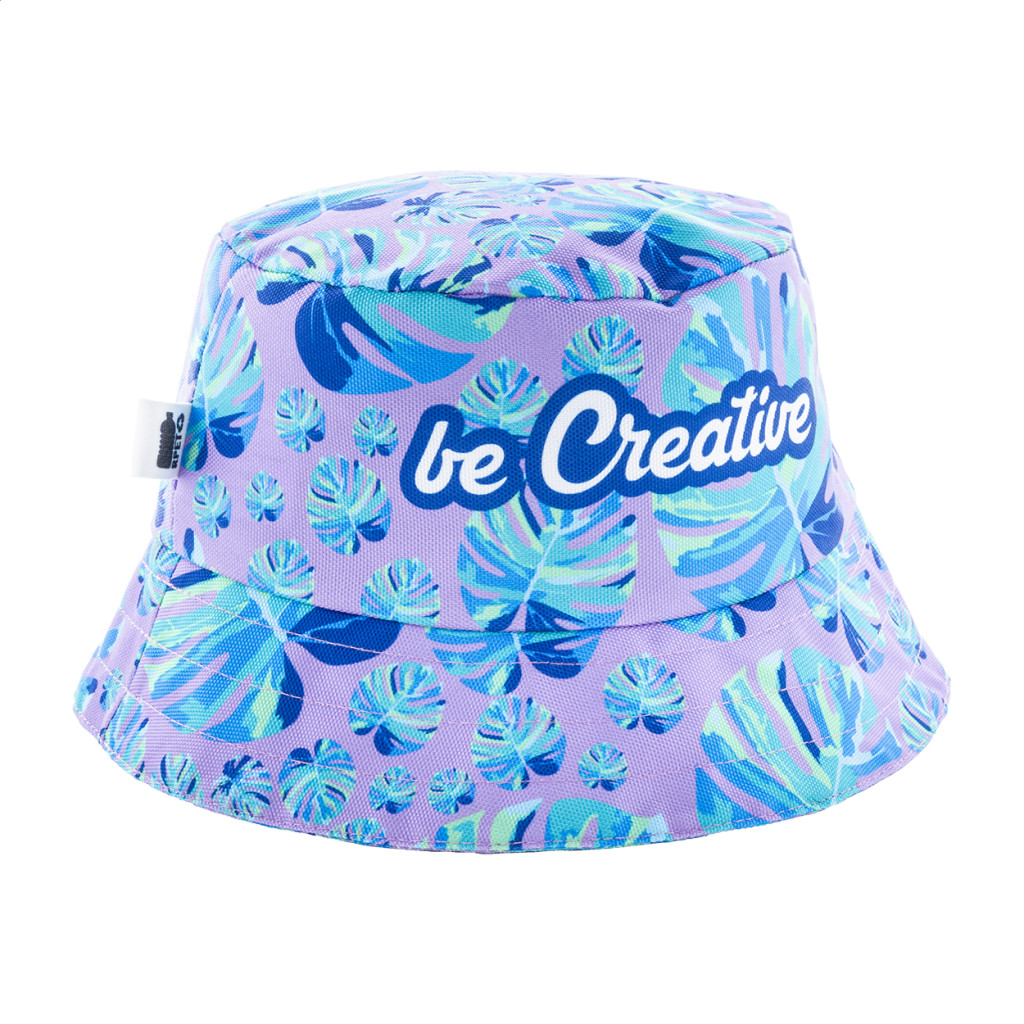 Egyedi gyártású RPET halászsapka, teljes felületén szublimációs nyomtatott grafikával. 600D RPET poliészterből (220 g/m²) készült, megkülönböztető RPET címkével. Minimális rendelési mennyiség: 25 db / méret. 3 méretben kapható: S (ø55cm gyereknek), M (ø58cm) és L (ø60cm).