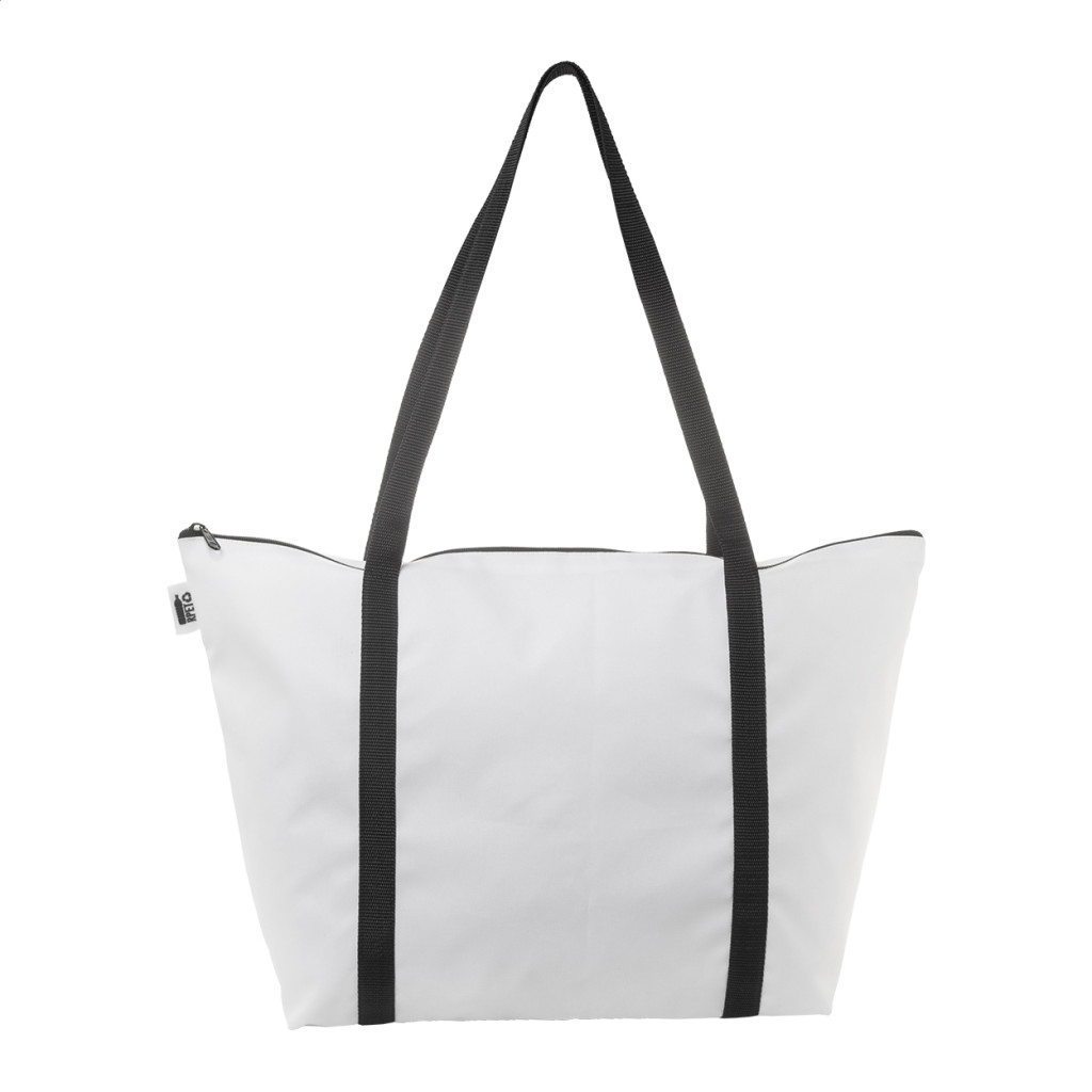 Egyedi gyártású, cipzáras strandtáska 600D RPET poliészterből, hosszú hordfüllel. Teljes felületén szublimációs eljárással emblémázva, megkülönböztető RPET címkével. Minimális rendelési mennyiség: 25 db.
