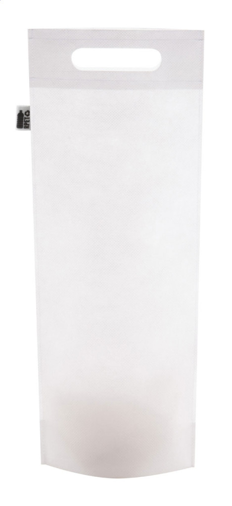 Egyedi gyártású, RPET non-woven anyagból készült ajándéktáska boros üveghez, 80 g/m². Mindkét oldal teljes felületén szublimációs eljárással emblémázva, megkülönböztető RPET címkével. Minimális rendelési mennyiség 50 db.
