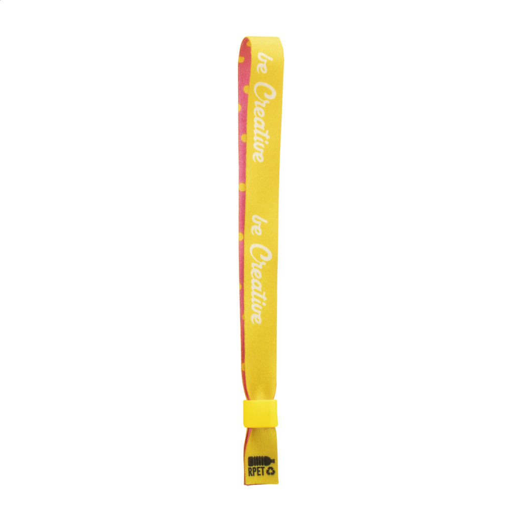 Egyedi gyártású, RPET poliészter fesztivál karszalag színes műanyag biztonsági zárral. Mindkét oldalon szublimációs nyomtatott grafikával. Minimális rendelési mennyiség: 100 db.