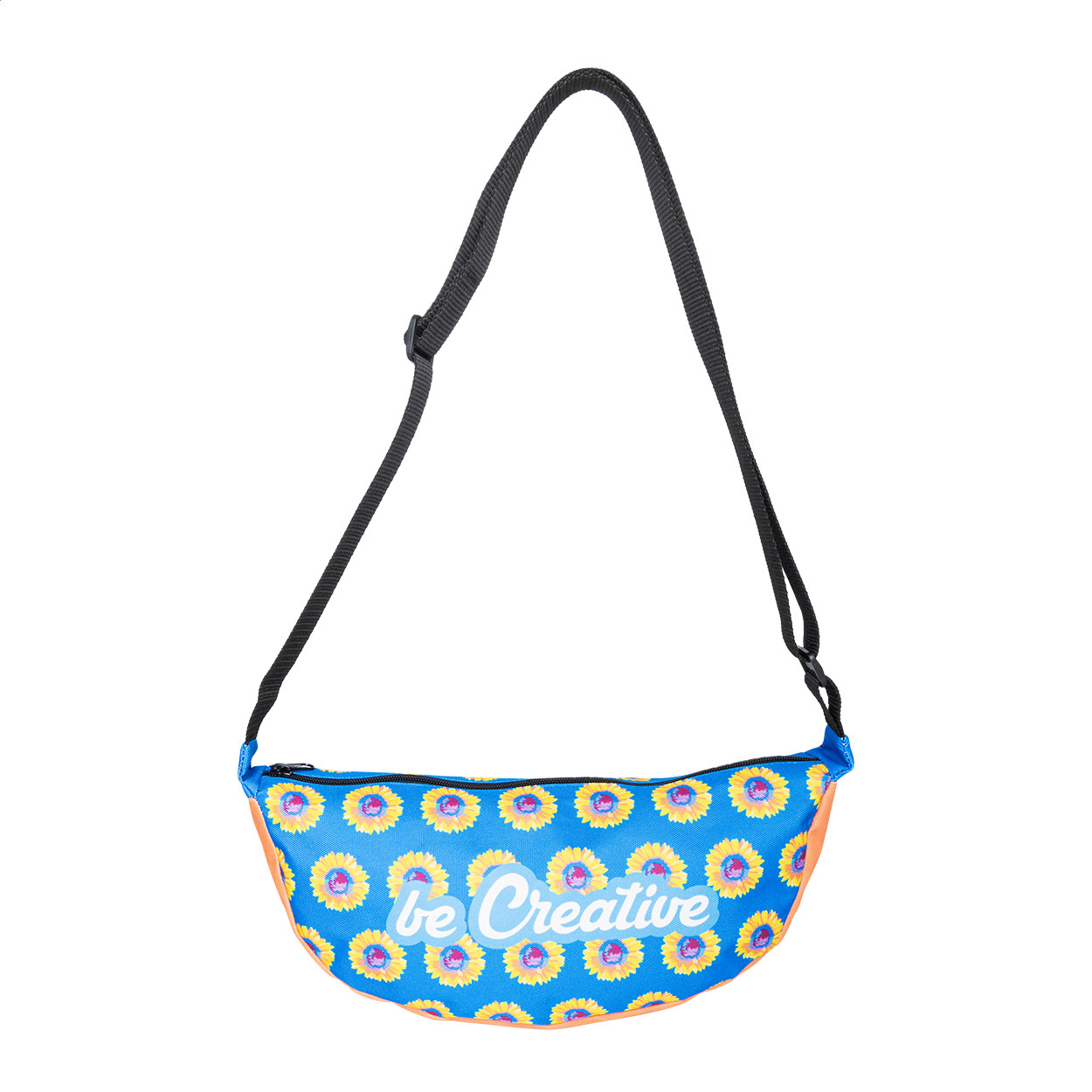 Egyedi gyártású oldaltáska 600D RPET poliészterből, állítható pánttal és cipzáras rekesszel. Teljes felületén szublimációs nyomtatott grafikával és megkülönböztető RPET címkével. Minimális rendelési mennyiség: 25 db.