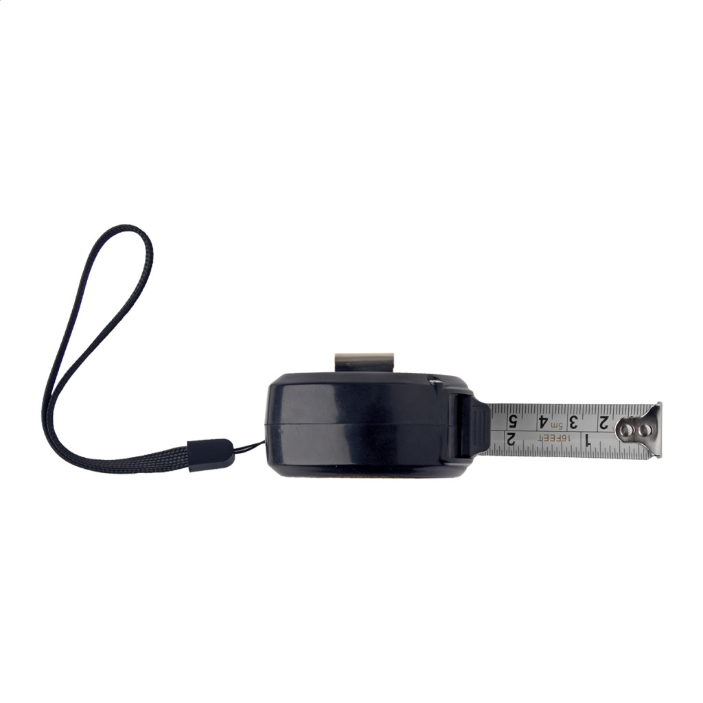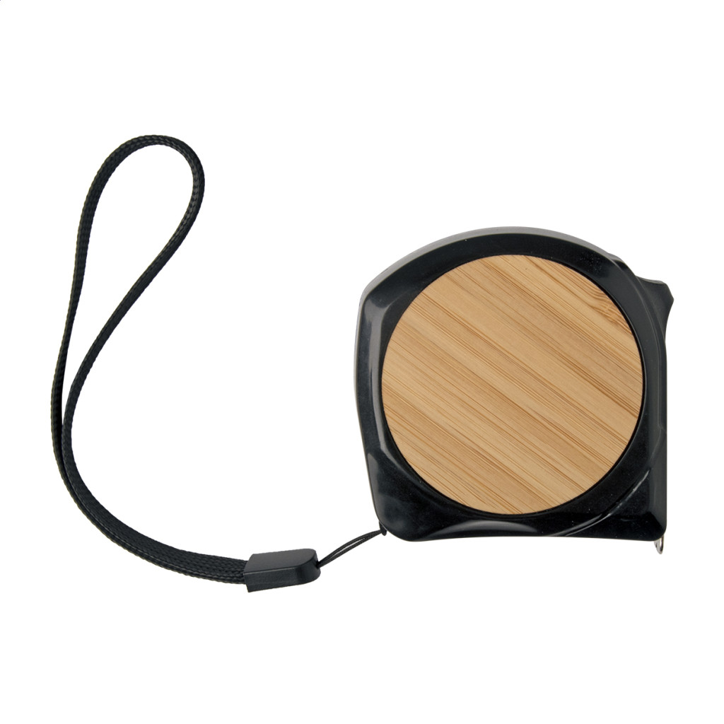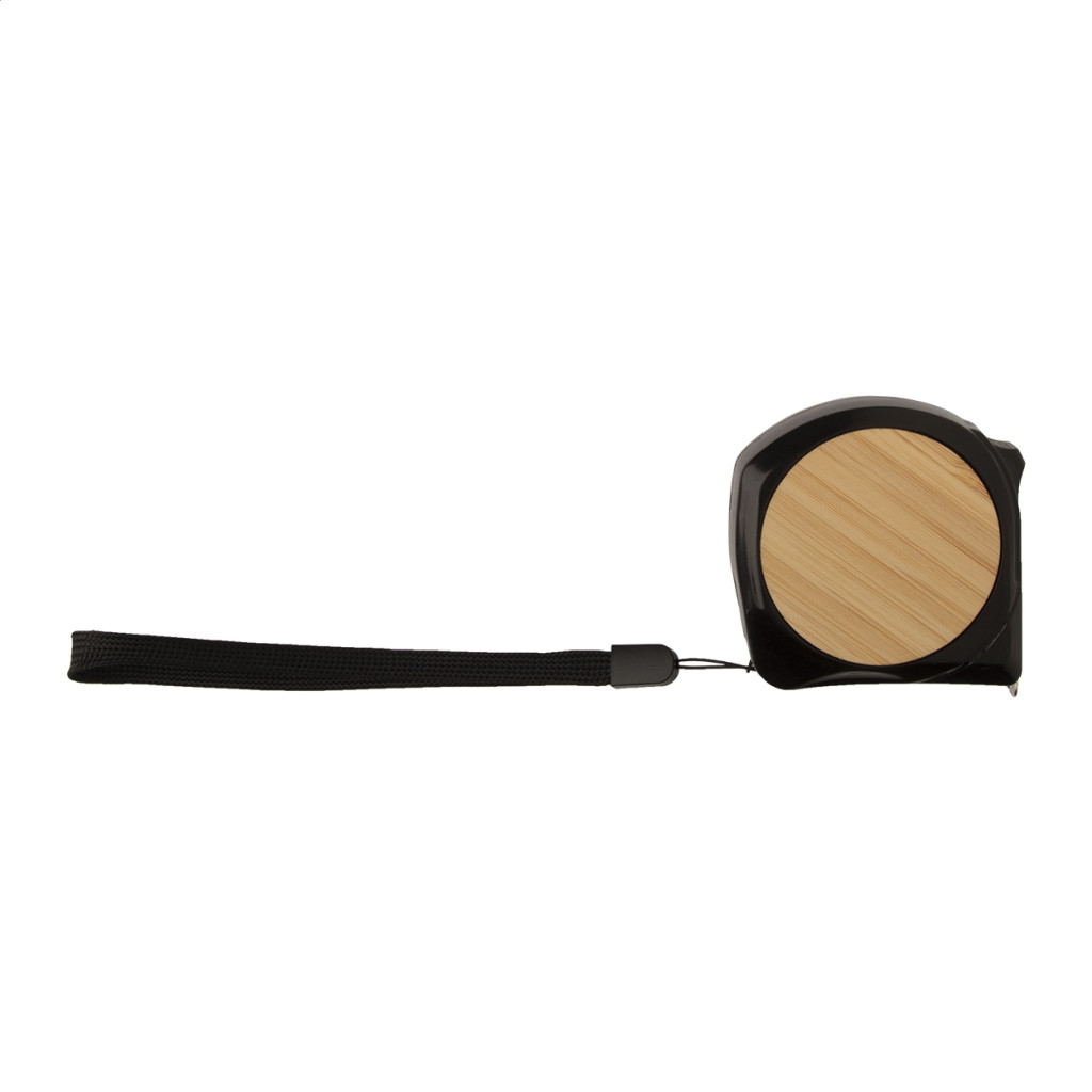 Műanyag és bambusz mérőszalag fékező funkcióval, fém klipsszel és csuklópánttal, 5 m.