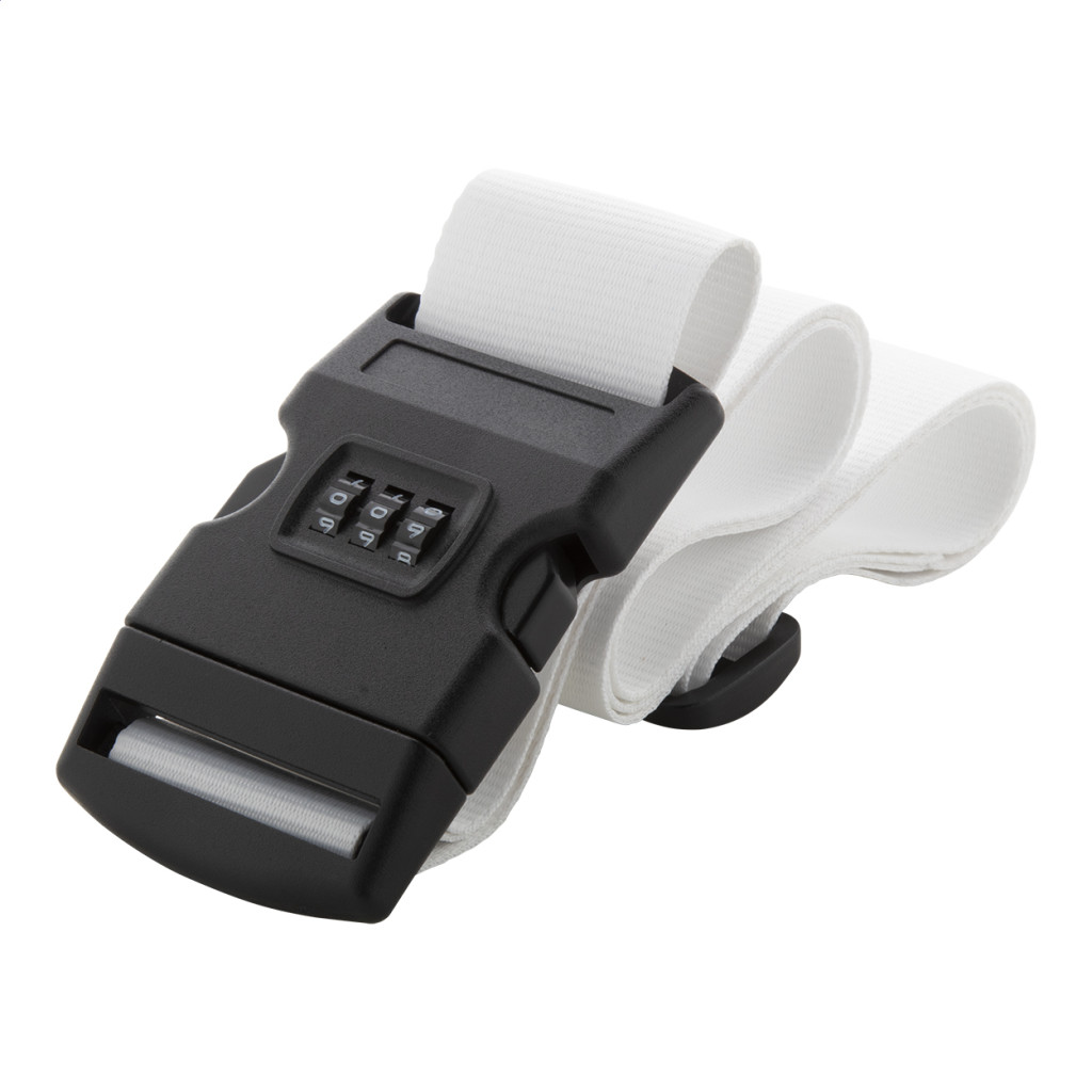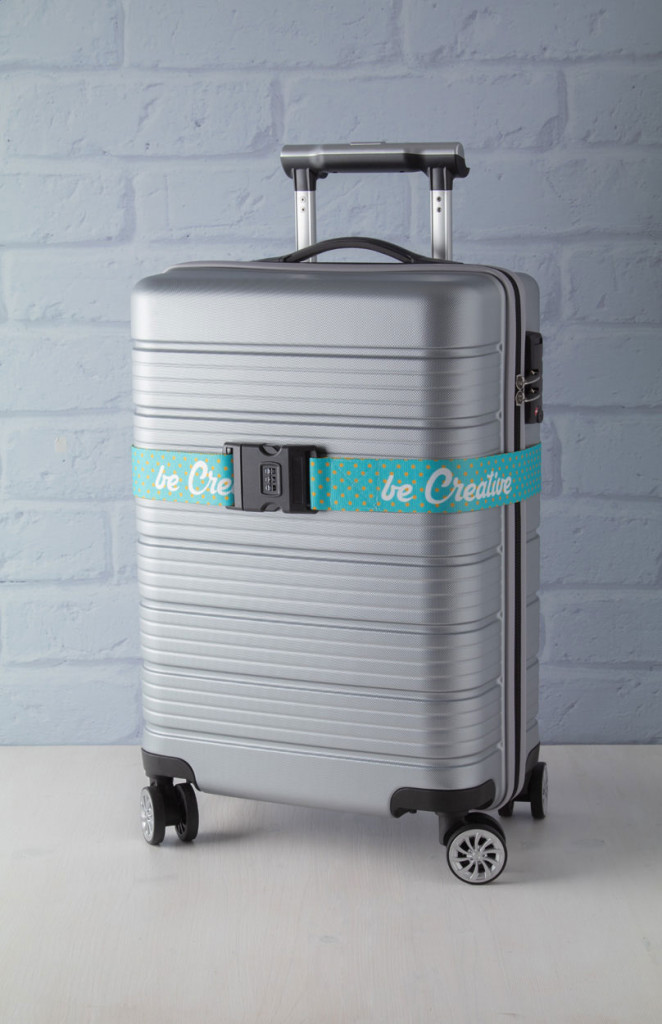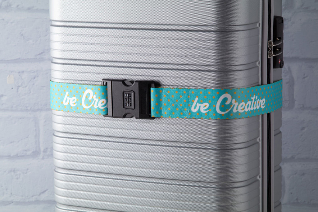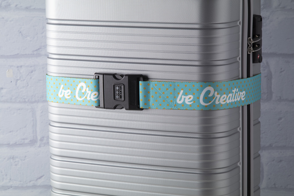 Egyedi gyártású, poliészter bőrönd heveder állítható pánttal és 3 számjegyű kóddal zárható lakattal. Mindkét oldalán szublimációs technológiával emblémázva. Minimális rendelési mennyiség: 50 db.