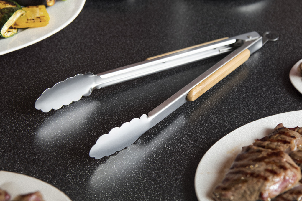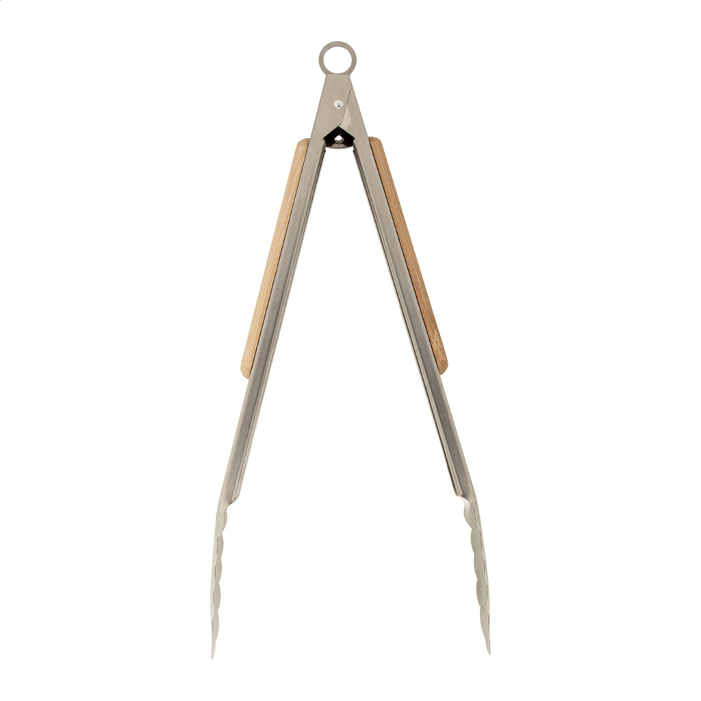 Rozsdamentes acél grill fogó bambusz nyéllel és zárral.