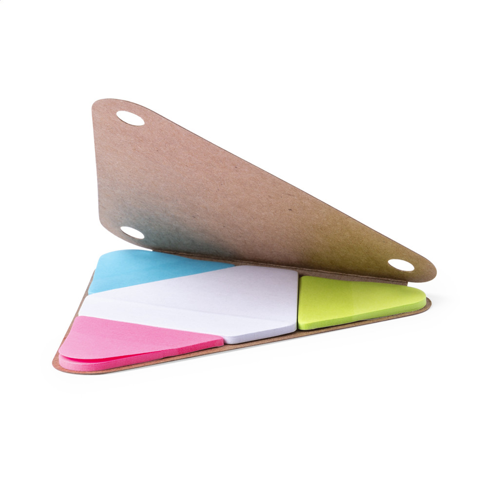 Háromszög alakú, újrahasznosított anyagból készült jegyzettömb, öntapadós jegyzetlappal, 2 méretben. 20 db hatszögű és 60 db háromszögű lapot tartalmaz.