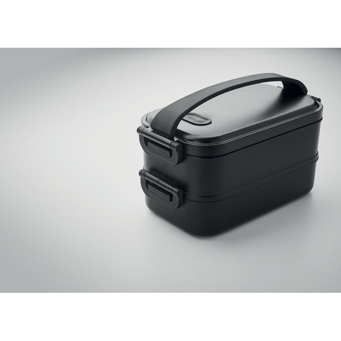 PP emeletes uzsonnásdoboz oldalsó zárócsatokkal, kivehető elválasztó résszel és légmentesen záródó fedéllel. Űrtartalom: 800 ml (2x).