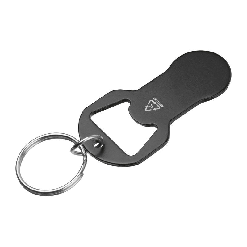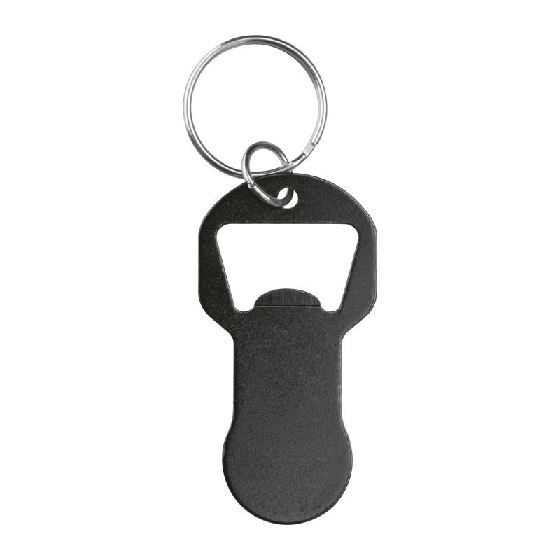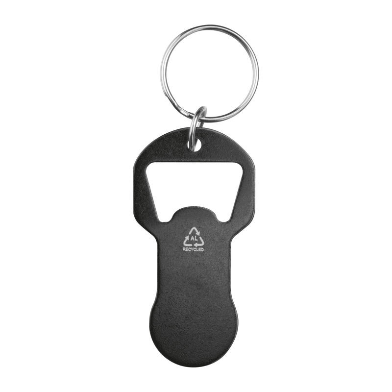 Kulcstartó újrahasznosított alumíniumból, integrált üvegnyitóval és bevásárlókocsi tokennel. Könnyű, praktikus és ideális mindennapi használatra.