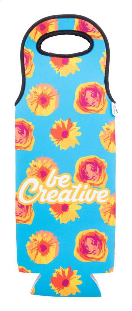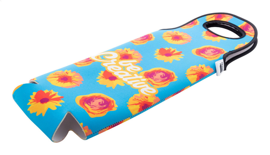 Egyedi gyártású, RPET neoprén boros ajándéktáska hordfüllel. Teljes felületén szublimációs nyomtatással ellátva. Minimális rendelési mennyiség: 25 db.