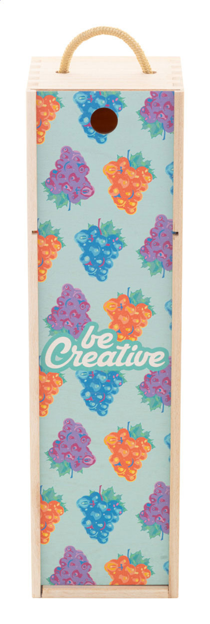Egyedi gyártású, fából készült boros ajándékdoboz zsinórral és full colour nyomtatott fedéllel. Az ár tartalmazza az UV LED nyomtatást. Minimális rendelési mennyiség: 50 db.