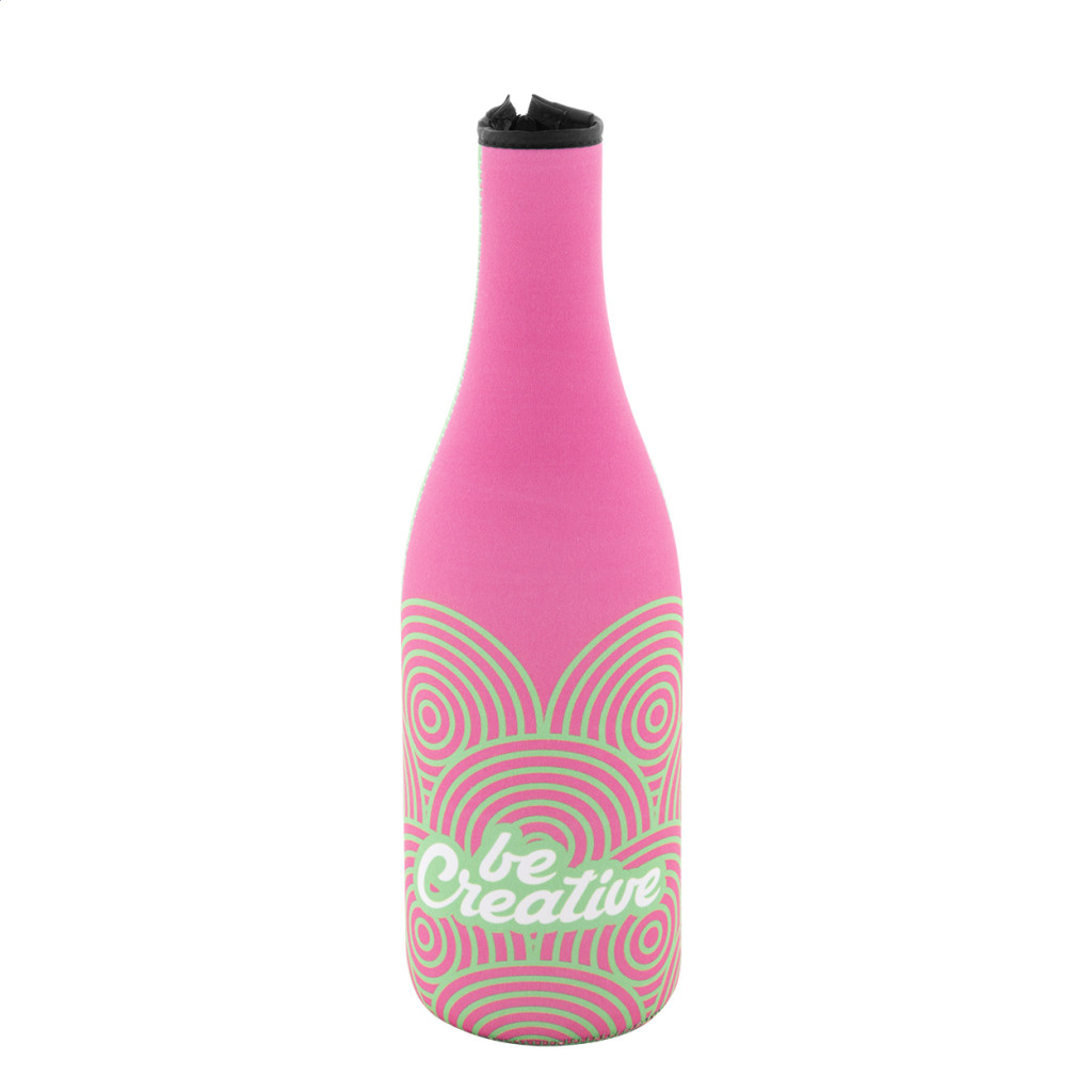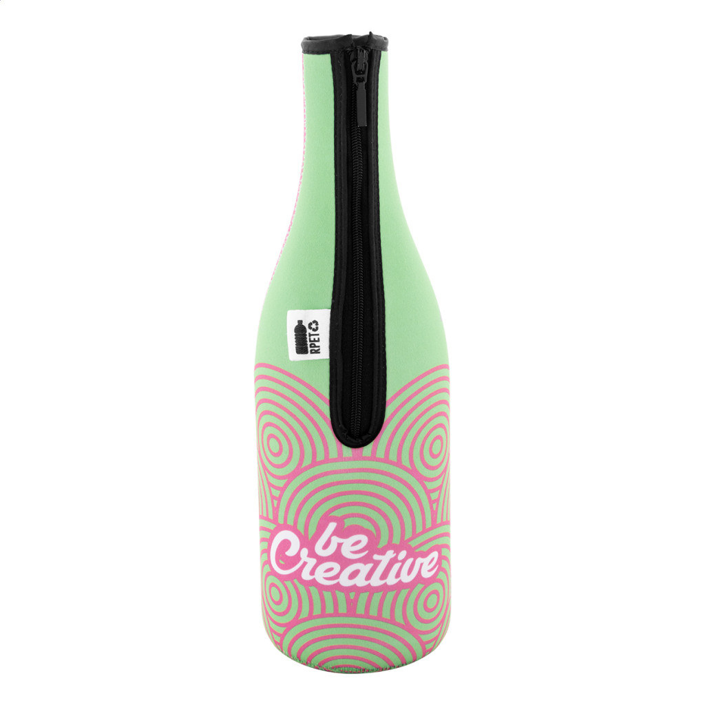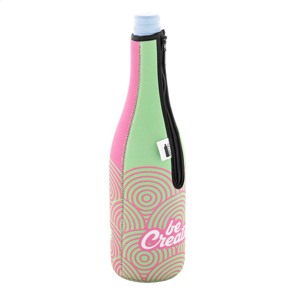 Egyedi gyártású, cipzáras RPET neoprén hűtő borítás boros- vagy pezsgősüveghez. Teljes felületén szublimációs nyomtatott grafikával. Minimális rendelési mennyiség: 25 db.