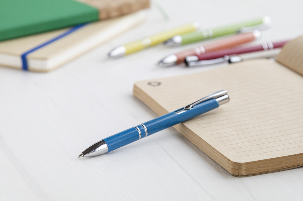 Környezetbarát búzaszalma műanyag golyóstoll fém részekkel. Kék tollbetéttel szállítjuk.