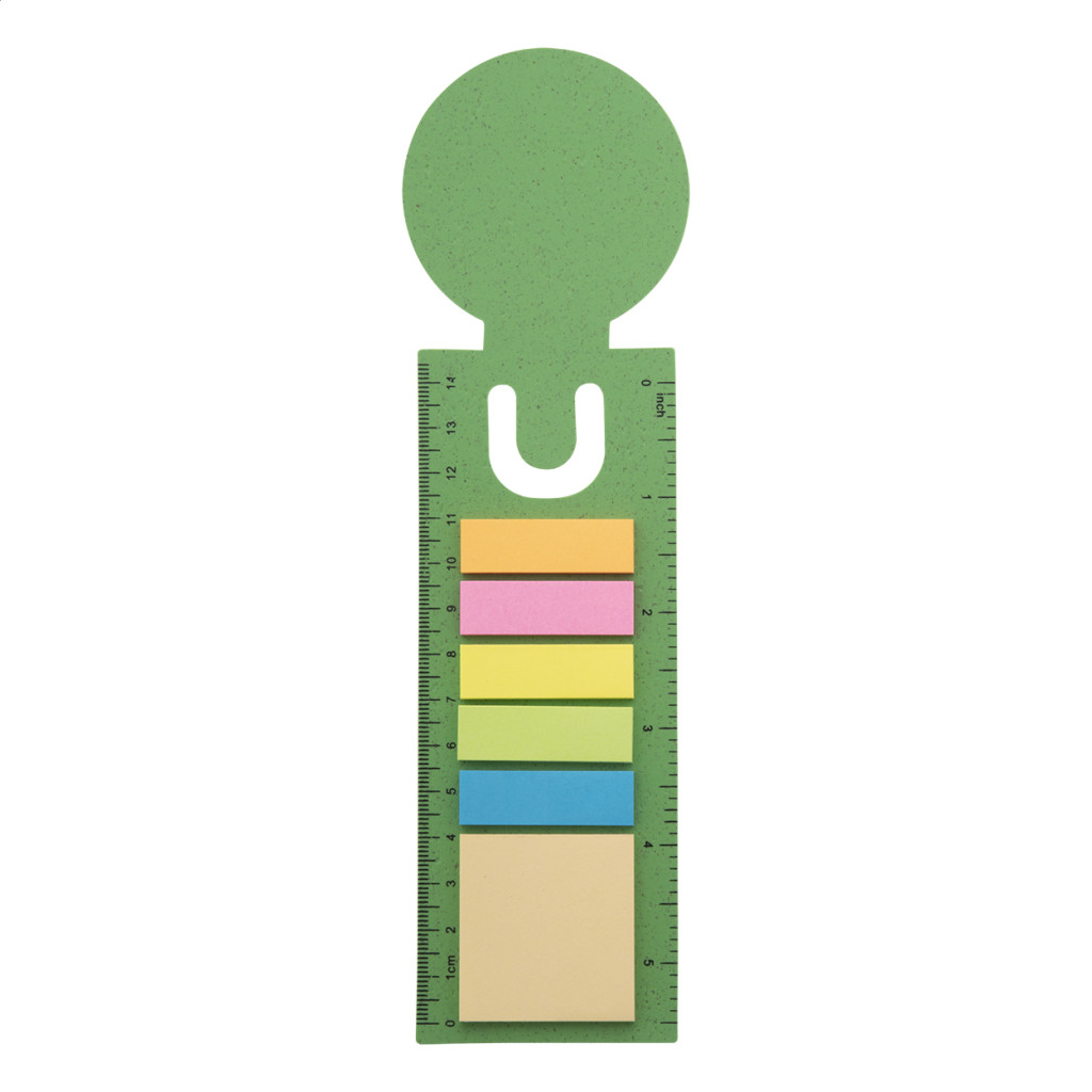 Ökológiai búzaszalma műanyag könyvjelző és vonalzó 25 öntapadós jegyzetlappal és 125 oldaljelölővel (5 féle színben).