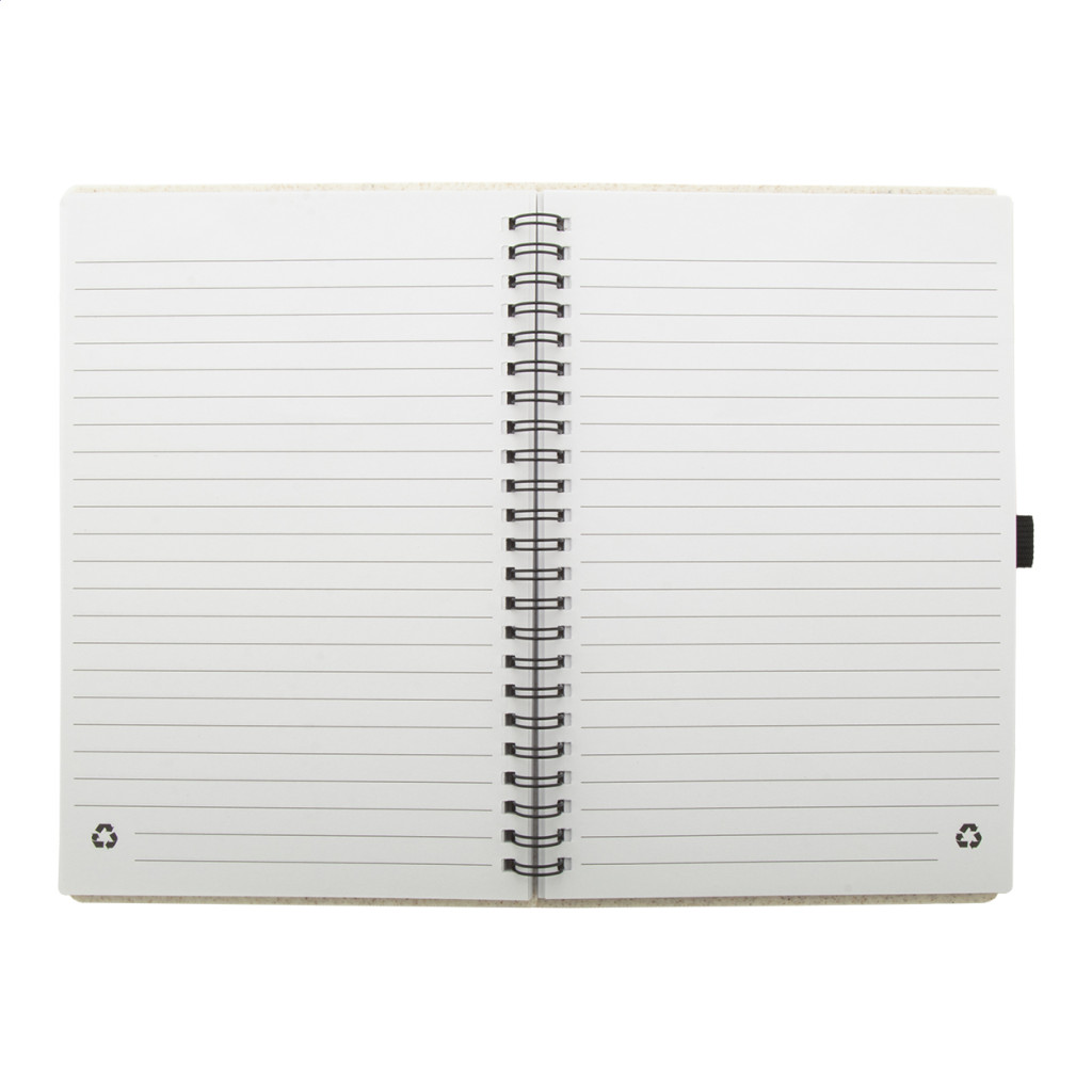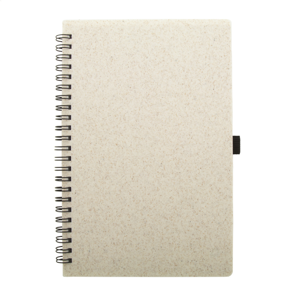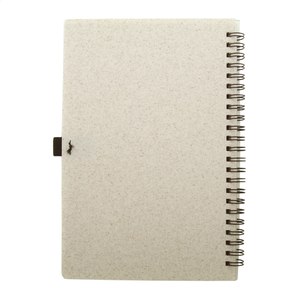 Ökológiai búzaszalma műanyag borítású spirál jegyzetfüzet újrahasznosított papírból készült 70 vonalas lappal és tolltartóval, A5 méret.