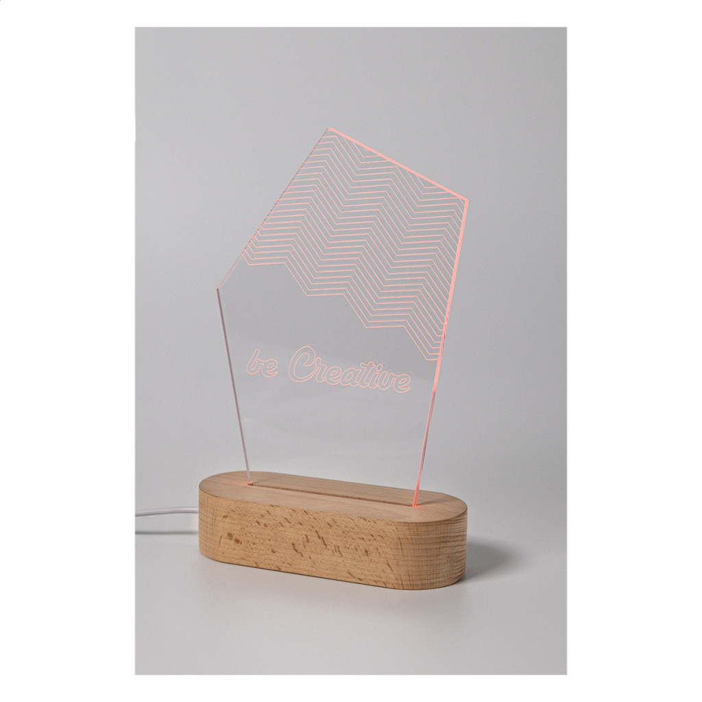 Egyedi gyártású akril trófea fa alapon, USB tápellátású többszínű LED lámpával. Egyedi formában, gravírozott grafikával. USB töltőkábellel. Az ár tartalmazza a gravírozást. Minimális rendelési mennyiség: 10 db.