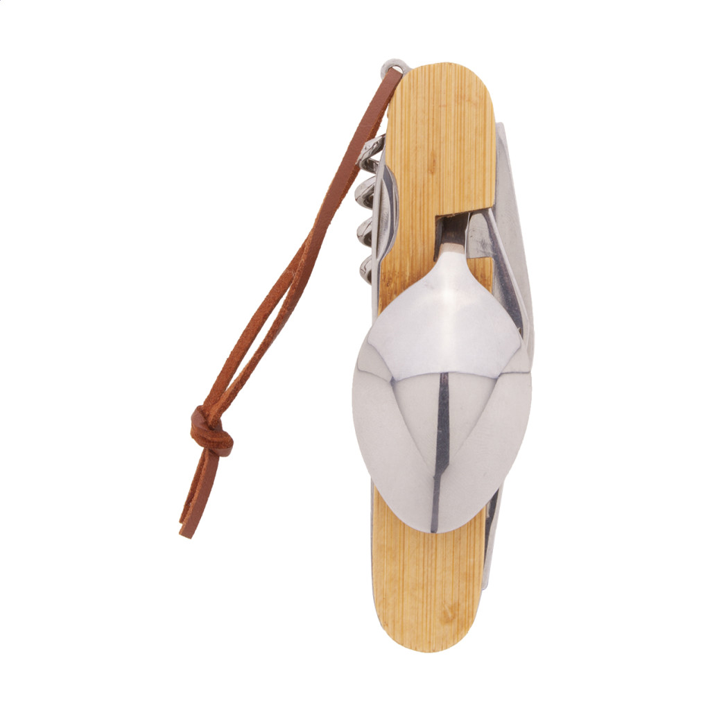 Rozsdamentes acélból készült többfunkciós zsebkés és összecsukható evőeszközkészlet bambusz nyéllel és PU bőr zsinórral. 7 funkcióval: kés, villa, kanál, üveg- és konzervnyitó, dugóhúzó és bőrlyukasztó. Evőeszközként használva 2 részre választható szét.