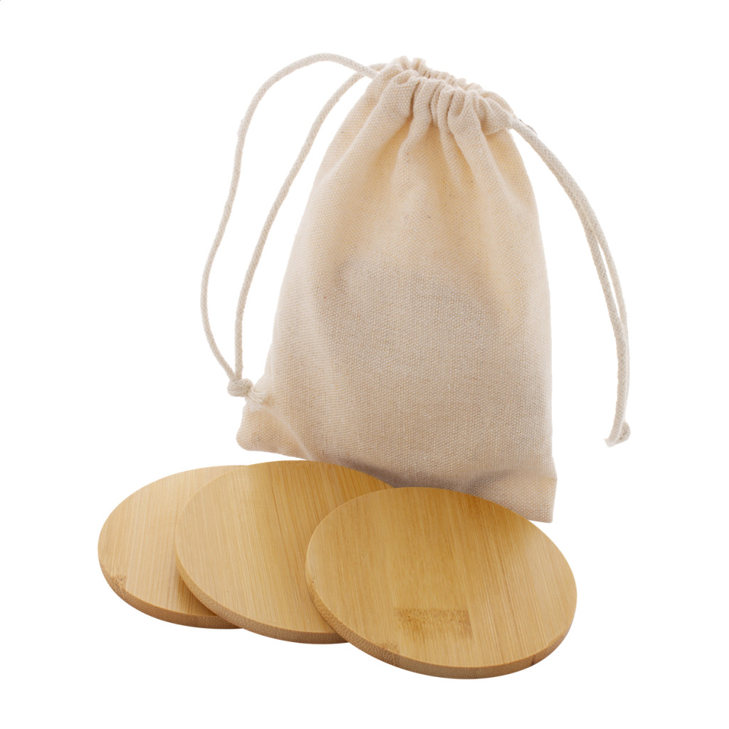 6 db-os kerek bambusz poháralátétszett zsinóros pamut tasakban.