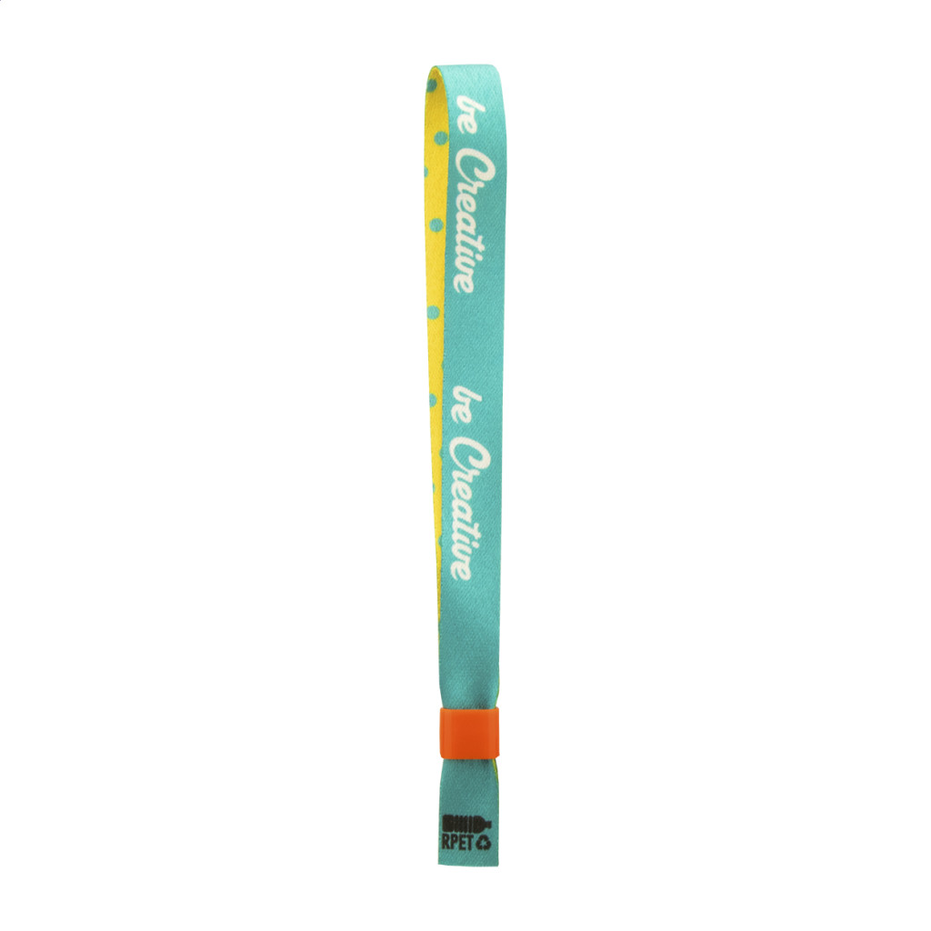 Egyedi gyártású, RPET poliészter fesztivál karszalag színes műanyag biztonsági zárral. Mindkét oldalon szublimációs nyomtatott grafikával. Minimális rendelési mennyiség: 100 db.