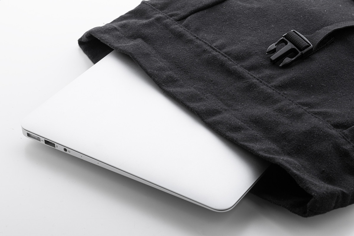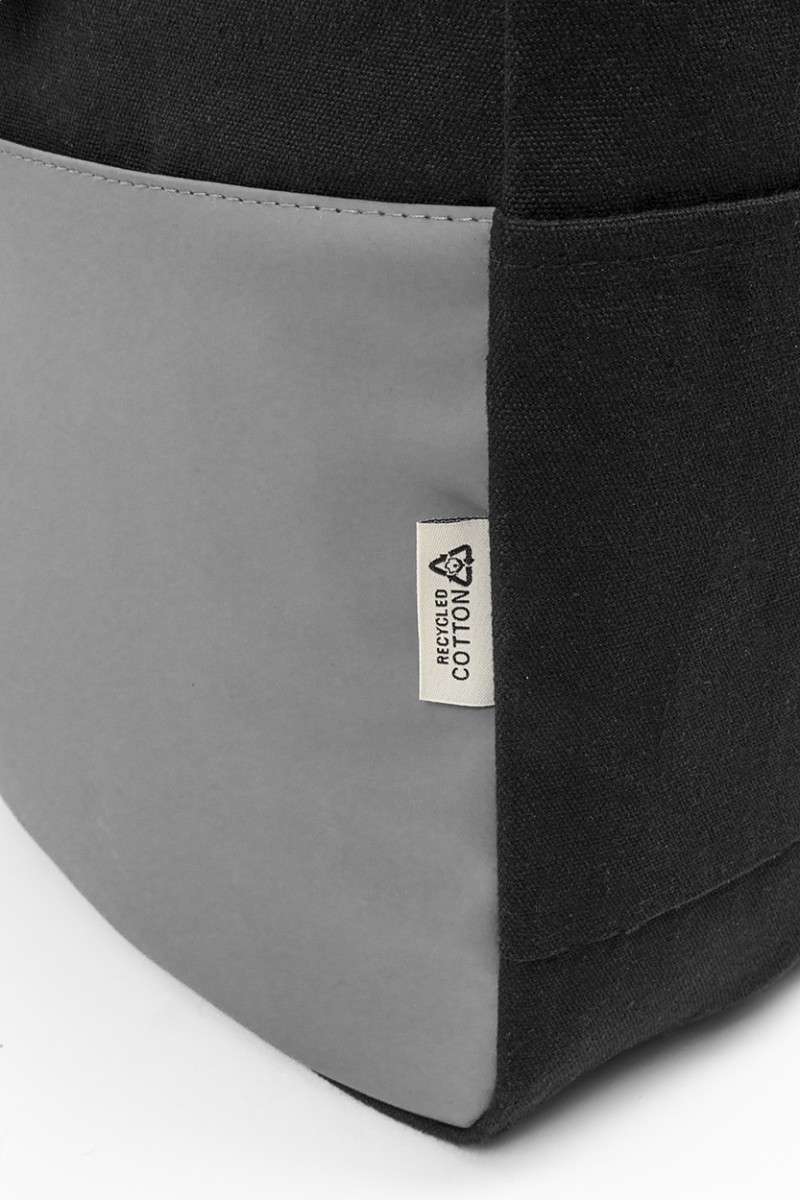 Újrahasznosított vászonból készült rolltop hátizsák csattal és cipzáras elülső zsebbel, puha, újrahasznosított PU bőrből. Párnázott laptop rekesszel (15"), oldalsó zsebekkel, párnázott hátrésszel és vállpántokkal. 70% újrahasznosított pamut és 30% RPET poliészter. Megkülönböztető újrahasznosított pamut címkével.