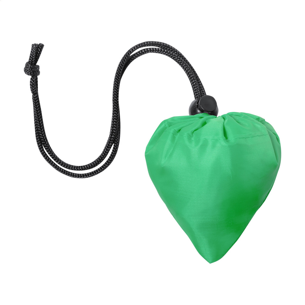 Összehajtható RPET bevásárlótáska hosszú hordfüllel. 190T RPET poliészter, megkülönböztető RPET címkével.