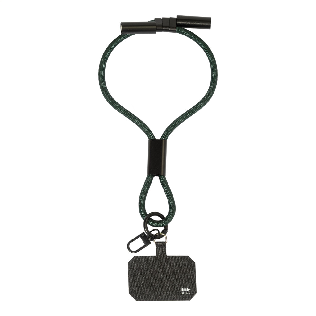 RPET mobiltartós csuklópánt telefonbetéttel, karabinerrel és beépített USB-C - USB-C töltőkábellel, rejtett csatlakozókkal. 60 W-os PD gyorstöltést és adatátvitelt támogat.