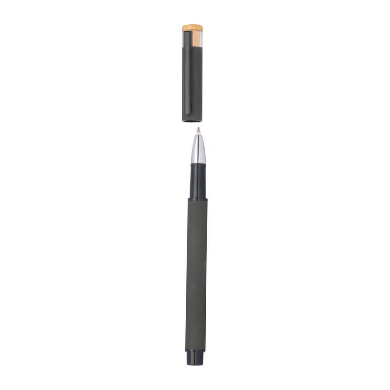 Írószer szett, amely egy kék színű, zselés (Semi-Gel) tollbetéttel ellátott golyóstollat és egy rollertollat tartalmaz újrahasznosított alumíniumból. Fém klipsz és bambusz nyomógomb tartozik hozzá, környezetbarát dobozban szállítva.